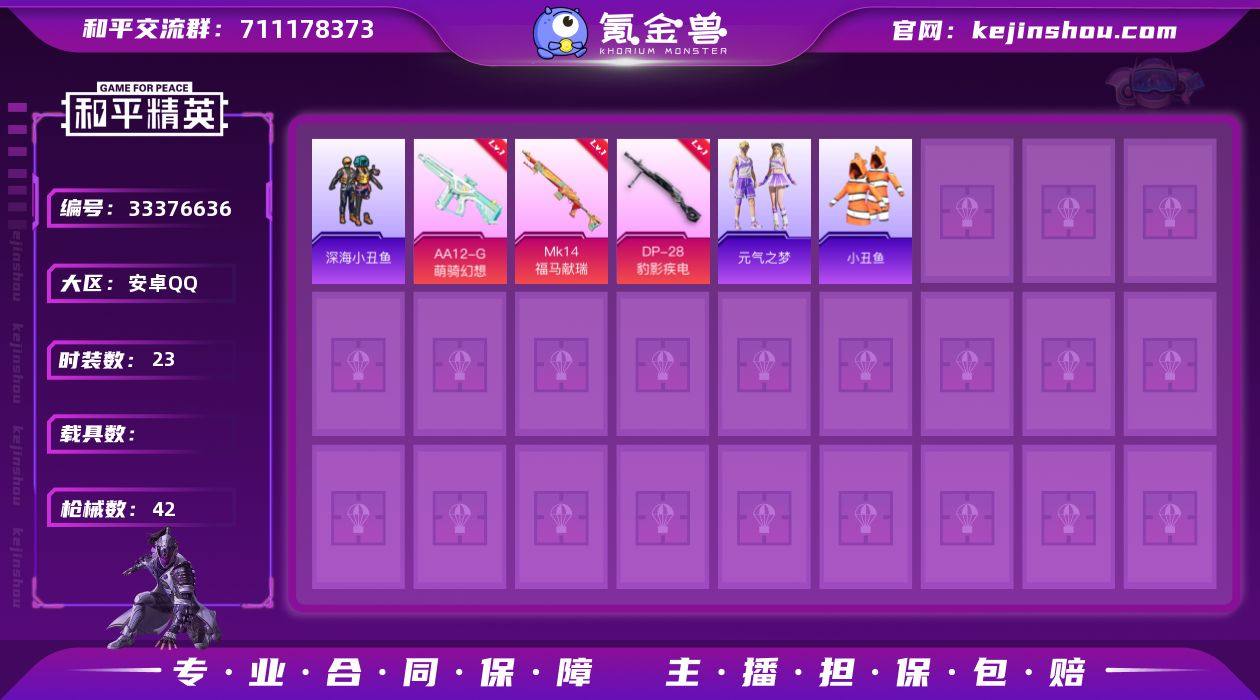 M1047639【可二次 满天赋3特效枪深海小丑鱼,小丑鱼】安卓手Q-3特效枪-23套装-42枪皮-0王牌印记-不朽星钻Ⅴ-9392热力值【3特效枪】AA12-G-萌骑幻想[1级],DP-28-豹影疾电[5级],Mk14-福马献瑞[5级]【3稀有】深海小丑鱼,小丑鱼,AKM-缤纷海域【2飞行器】炫彩糖果飞行器,狂鲨锋刃飞行器【59其它衣服和枪皮】阳光火鸡,SS35特训,马上有钱,狙击之神,炫彩糖果,王牌教练,黑色伏地魔,迅捷龙虾,魅力单车,老实芭蕉,旭日情侣,疯狂小兔子,SS37特训,元气之梦,龙的传人,海岛探路者,SS38特训,海盐绵绵冰,福马献瑞,萌鸡速递,街头潮人,Famas-霓彩脉冲,十字弩-异瞳寒姬,GROZA-海盐豹豹,信号枪-异瞳寒姬,蜜獾-启元战纹,GROZA-紫矿核心,MG3-火熔核心,S12K-霓彩脉冲,UZI-炫彩糖果,铝热弹-炫彩糖果,VSS-香桃花海,Vector-荒原烈焰,ARX-像素花束,DP-28-彩虹符号,GROZA-福马献瑞,SLR-霓彩脉冲,SKS-迅猛狂鲨,SCAR-L-海盐豹豹,SVD-霓彩脉冲,AKM-星之彼岸,AKM-涂鸦街区,20-H-狂鲨锋刃,AMR-鸡智如我,Mk14-紫晶流影,MG3-幻世战舞者,AUG-冰晶雪宝,大砍刀-像素花束,P90-紫矿核心,SPAS-12-狂鲨锋刃,汤姆逊-天降萌叽,ACE32-冰晶雪宝,AWM-天降萌叽,破片手榴弹-拽到爆炸,DBS-乌木金纹,AKS-74U-乌木金纹,QBU-乌木金纹,SLR...