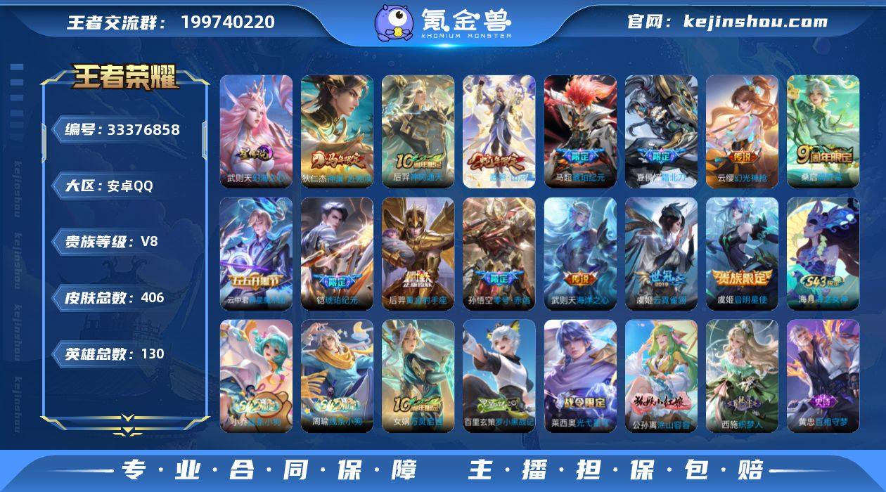 王者20689,3525星币,安卓Q-V8-永恒钻石II段位-130英雄-406皮肤-1典藏英雄-14传说-118史诗 【英雄全皮】:刘邦全皮,孙权全皮,鬼谷子全皮,敖隐全皮,司空震全皮,戈娅全皮,空空儿全皮,影全皮 【荣耀典藏】:武则天英雄 【传说皮肤】:狄仁杰神骥赴朔漠,后羿神树通天,司空震愿照山河定,云缨幻光神枪,桑启鸣野蒿,夏侯惇霜北刀,云中君群星魔术团,马超琥珀纪元,铠琥珀纪元,虞姬启明星使,孙悟空零号赤焰,虞姬云霓雀翎,后羿黄金射手座,武则天海洋之心 【限定皮肤】:白起狰,夏侯惇霜北刀,蔡文姬夏日便利店,大乔绒语心约,虞姬夏日便利店,姜子牙天穹之誓,杨戬破阵退雄兵,狄仁杰阴阳师,赵云皇家上将,墨子神迹守卫,嬴政优雅恋人,嬴政白昼王子,孙尚香蔷薇恋人,鲁班七号狮舞东方,庄周高山流水,阿轲迷踪丽影,钟无艳超时空战士,扁鹊奇幻香踪,白起夜都怪侠,芈月重明,芈月白晶晶,芈月幻夜卜梦,吕布猎兽之王,周瑜赤莲之焰,元歌云间偶戏,元歌无心,夏侯惇朔风刀,甄姬落雪兰心,曹操烛龙,典韦穷奇,马可波罗暗影游猎,马可波罗山海玄木吟,狄仁杰魔术师,狄仁杰万华元夜,达摩星际陆战队,达摩沙漠行僧,项羽海滩派对,老夫子醍醐杖,老夫子航海奇...