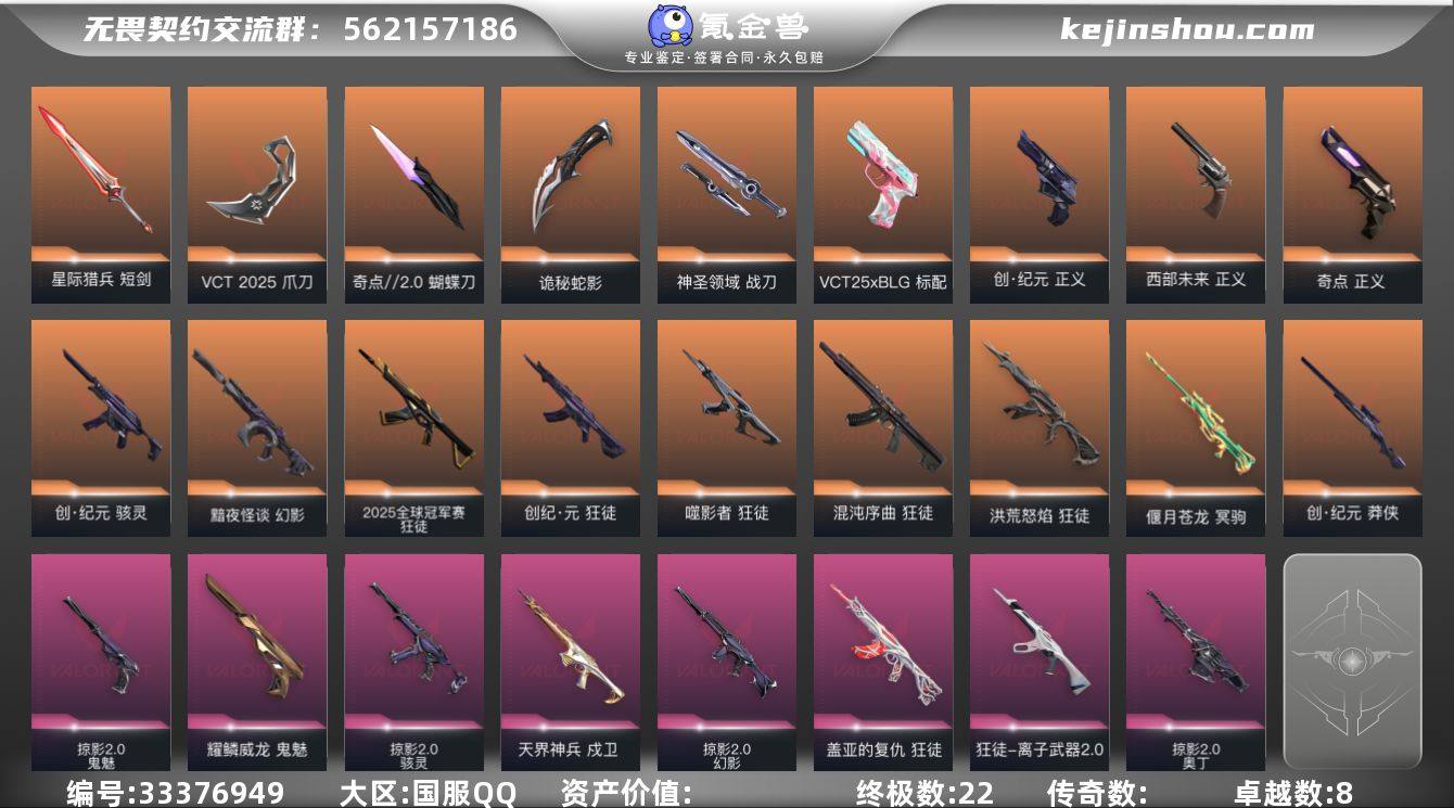 【PTWW3888】LV等级145/皮肤总价值48190/段位未定级/总皮肤数量97/刀皮数量9/枪皮数量88/套装数量3/具体详情请看图/VCT 2025赛季礼包/创·纪元套装/掠影2.0套装/幻棱/炼狱/暮蝶/钛狐/壹决/铁臂/捷风/雷兹/幽影/不死鸟/贤者/猎枭/零/芮娜/尚勃勒/霓虹/夜露/K/O/盖可/黑梦/近战武器-碎心裂刃/影钩/剥皮小刀/蝴蝶刀-奇点//2.0/VCT 2025 爪刀/镭切/诡秘蛇影/神圣领域 战刀/星际猎兵 短剑/2025全球冠军赛 狂徒/狂徒-洪荒怒焰/狂徒-混沌序曲/狂徒-创·纪元/狂徒-噬影者/狂徒-盖亚的复仇/狂徒-离子武器2.0/狂徒-诡秘蛇影/幻影-黯夜怪谈/幻影-掠影2.0/幻影-神圣领域/幻影-末日之翼/戍卫-天界神兵/戍卫-月球哨兵/戍卫-折光棱晶/獠犬-神圣领域/冥驹-偃月苍龙/冥驹-星云暗涌/飞将-末日之翼/莽侠-创·纪元/莽侠-诡秘蛇影/莽侠-月球哨兵/战神-神圣领域/奥丁-掠影2.0/奥丁-末日之翼/判官-诡秘蛇影/雄鹿-月球哨兵/骇灵-创·纪元/骇灵-掠影2.0/骇灵-星云暗涌/蜂刺-星云暗涌/蜂刺-折光棱晶/标配-折光棱晶/标配-VCT25xBLG/正义-奇点/正义-创·纪元/正义-西部未来/正义-月球哨兵/鬼魅-耀鳞威龙/鬼魅-掠影2.0/鬼魅-诡秘蛇影/鬼魅-星云暗涌/狂怒-神圣领域/短炮-末日之翼/精灵大战 卡面/南瓜盛典 卡面/音...