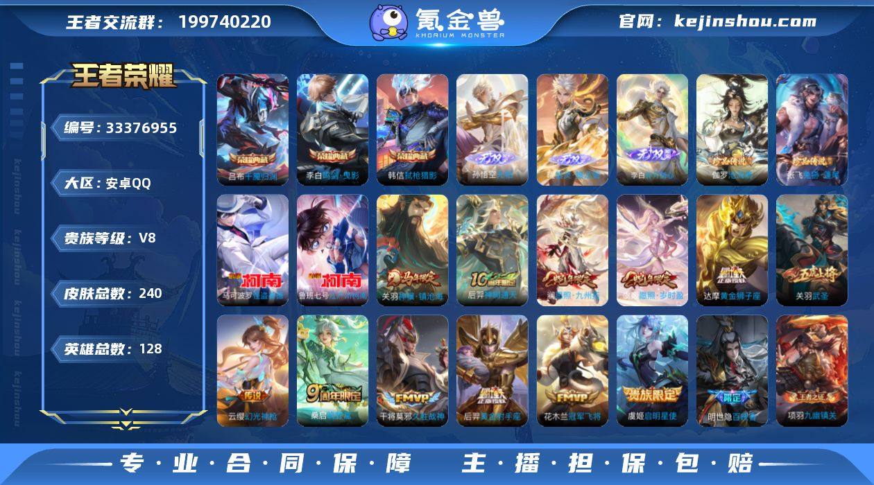 CHC40092 安卓Q-V8-至尊星耀IV段位-128英雄-240皮肤-3典藏皮肤-3无双-4珍品传说-12传说-73史诗 【英雄全皮】:孙权全皮,敖隐全皮,空空儿全皮 【荣耀典藏】:李白鸣剑曳影,韩信弑枪猎影,吕布千魇归渊 【无双皮肤】:孙悟空无相,曜器灵螭龙剑,李白碎月剑心 【珍品传说】:伽罗沧流箭,张飞兔狲蓬尾,鲁班七号江户川柯南,马可波罗怪盗基德 【传说皮肤】:关羽神骥镇沧海,后羿神树通天,澜愿照九州拓,虞姬愿照岁时盈,云缨幻光神枪,桑启鸣野蒿,虞姬启明星使,关羽武圣,干将莫邪久胜战神,达摩黄金狮子座,花木兰冠军飞将,后羿黄金射手座 【限定皮肤】:狄仁杰阴阳师,赵云皇家上将,赵云引擎之心,赵云龙胆,鲁班七号狮舞东方,高渐离玩趣恶龙,芈月幻夜卜梦,吕布御风骁将,元歌无心,狄仁杰魔术师,狄仁杰万华元夜,达摩星际陆战队,达摩沙漠行僧,项羽海滩派对,老夫子醍醐杖,关羽武圣,程咬金演武夺筹,露娜一生所爱,韩信逐梦之影,韩信傲雪梅枪,王昭君凤凰于飞,兰陵王金庭之子,牛魔御旌,李元芳云中旅人,虞姬启明星使,钟馗驱傩正仪,鬼谷子五谷丰年,黄忠火炮绅士,苏烈千军破阵,沈梦溪大漠名商,裴擒虎擒涛扼浪,米莱狄胡桃异想国,盾山御銮,嫦娥暖冬...