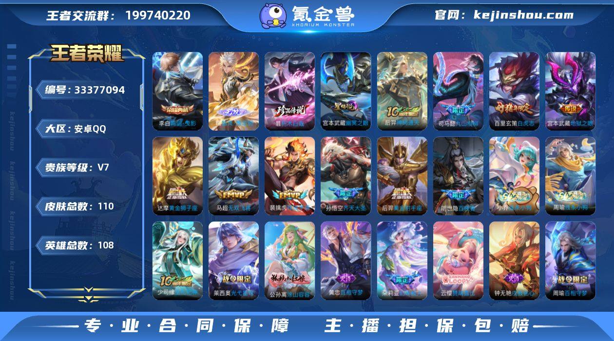 【精品推荐·金标扁鹊·器灵螭龙剑·鸣剑曳影·朽木白哉·白虎志·珍奇宝·幽冥之眼·九山相柳·齐天大圣·无双飞将·祥瑞亨通·至尊宝·无心·可二次】YXw24111-安卓Q-108英雄-110皮肤-3王者印记-80铭文-贵族积分2w【贵族7】【1典藏·1无双·珍品·1星传说·9传说·天幕·8按键】【因赛季更新游戏段付以上号为准!】 【英雄全皮】:孙权全皮,敖隐全皮,空空儿全皮 【荣耀典藏】:李白鸣剑曳影 【无双皮肤】:曜器灵螭龙剑 【珍品传说】:暃朽木白哉 【星元皮肤】:宫本武藏幽冥之眼 【传说皮肤】:后羿神树通天,司马懿九山相柳,裴擒虎祥瑞亨通,孙悟空齐天大圣,马超无双飞将,达摩黄金狮子座,百里玄策白虎志,后羿黄金射手座,宫本武藏地狱之眼 【限定皮肤】:虞姬夏日便利店,狄仁杰阴阳师,赵云皇家上将,墨子降魔,元歌无心,狄仁杰魔术师,项羽海滩派对,孙悟空至尊宝,孙悟空齐天大圣,百里玄策白虎志,裴擒虎李小龙,艾琳流音漫舞,妲己灵卜魔法,安琪拉乘龙聚宝船 【年限皮肤】:百里玄策白虎志,安琪拉乘龙聚宝船 【赛季限定】:钟馗虚灵犬护,甄姬逆浪荇歌,亚瑟荣光之誓 【战令限定】:艾琳流音漫舞,妲己灵卜魔法,虞姬夏日便利店,孙悟空神迹守卫,周瑜百相守梦,孙策百相守梦,...
