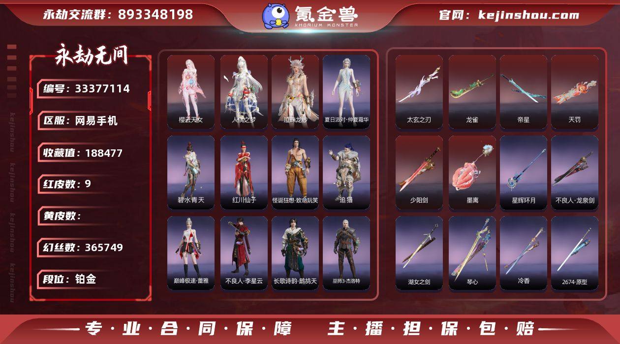 【红皮】:墨离(飞索皮肤),少阳剑(长剑皮肤),泣珠龙纱(崔三娘皮肤),天罚(火炮皮肤),樱云天女(胡桃皮肤),帝星(横刀皮肤),龙雀(阔刀皮肤),人偶之梦(妖刀姬),太玄之刃(太刀) 【外观总数】9红 259金 幻丝:365749金砖: 收藏值:18W 【换绑】:4/16 可换绑,期间登录网易大神不影响正常游戏,其他皮肤可参考以下截图,道具、段位以实际验号为准,段位因赛季原因发生变化,以上号为准"