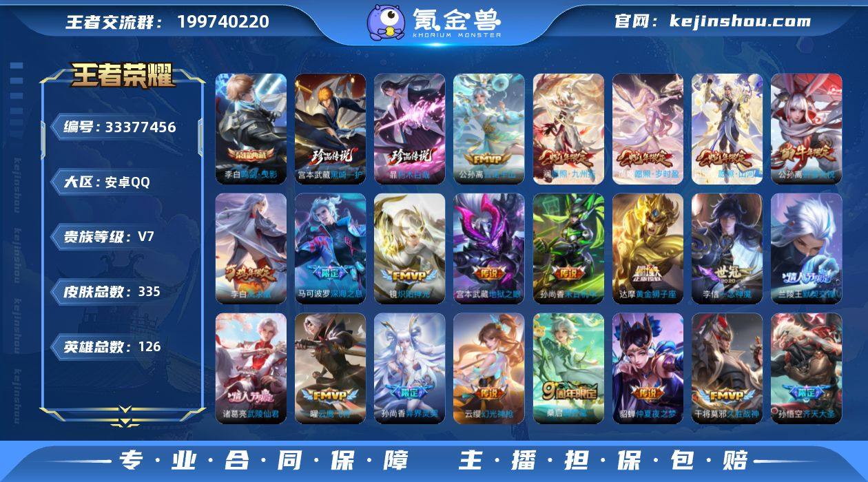 编号100054 可二次 v8 335皮肤 1典藏 2珍品传说 27传说 2星传说(未来机甲 金色仲夏夜)1皇冠 鸣剑·曳影 黑崎一护 朽木白哉 凤求凰 至尊宝 神威 愿照·九州拓 愿照·山河定 愿照·岁时盈 默契交锋(男) 武陵仙君 祈雪灵祝 无尽星芒 深海之息 齐天大圣 孙行者 引擎之心 一生所爱 飞衡 默契交锋 白鹤梁神女 神奇女侠 白晶晶 云诺千山 幻光神枪 云鹰飞将 绛天战甲 云霓雀翎
