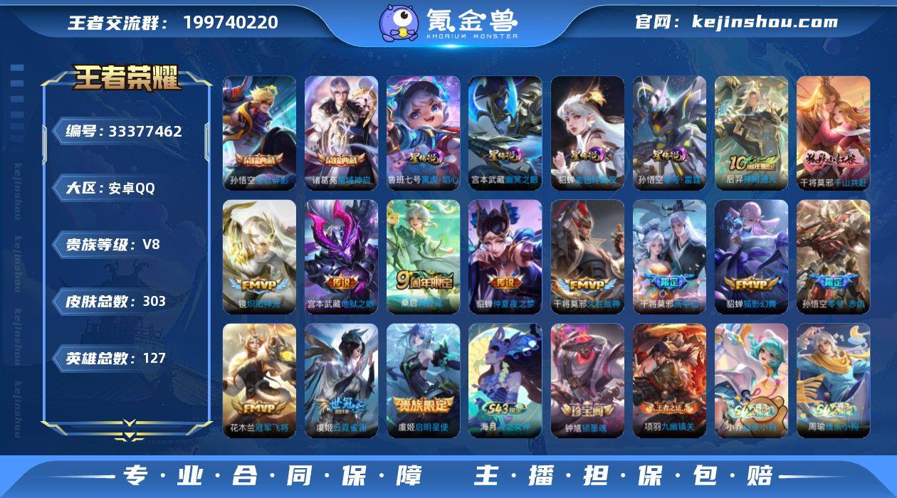 王者20685,308夺宝次数,安卓Q-V8-至尊星耀V段位-127英雄-303皮肤-2典藏皮肤-13传说-68史诗 【英雄全皮】:鬼谷子全皮,空空儿全皮 【荣耀典藏】:孙悟空全息碎影,诸葛亮星域神启 【传说皮肤】:后羿神树通天,干将莫邪千山共赴,桑启鸣野蒿,干将莫邪画中仙,镜炽阳神光,虞姬启明星使,孙悟空零号赤焰,貂蝉猫影幻舞,干将莫邪久胜战神,虞姬云霓雀翎,花木兰冠军飞将,貂蝉仲夏夜之梦,宫本武藏地狱之眼 【限定皮肤】:姜子牙天穹之誓,李白谪仙醉月,狄仁杰阴阳师,赵云皇家上将,孙尚香蔷薇恋人,鲁班七号乒乒小将,庄周高山流水,吕布御风骁将,元歌无心,夏侯惇朔风刀,狄仁杰魔术师,狄仁杰万华元夜,达摩沙漠行僧,项羽海滩派对,老夫子醍醐杖,关羽百相守梦,程咬金演武夺筹,韩信傲雪梅枪,兰陵王金庭之子,孙悟空至尊宝,孙悟空零号赤焰,孙悟空孙行者,牛魔御旌,李元芳云中旅人,虞姬启明星使,钟馗驱傩正仪,干将莫邪胡桃夹子,干将莫邪画中仙,鬼谷子原初探秘者,鬼谷子五谷丰年,苏烈千军破阵,百里玄策原初追逐者,弈星混沌棋,沈梦溪大漠名商,明世隐疑决卦,裴擒虎擒涛扼浪,狂铁御狮,米莱狄御霄,盾山御銮,上官婉儿梁祝,嫦娥拒霜思,鲁班大师探海日...