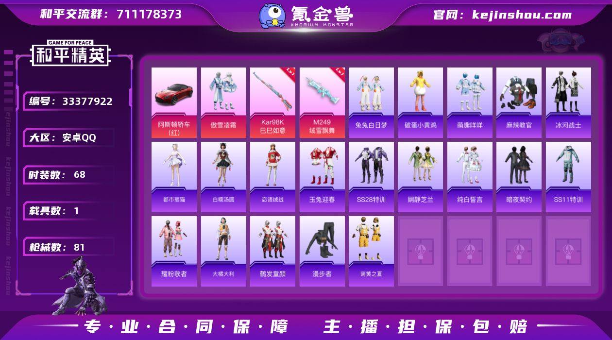 M1047622【1载具-1粉装-2特效 傲雪凌霜 M249-绒雪飘舞[7级]】安卓手Q-1载具-1粉装-2特效枪-68套装-81枪皮-2王牌印记-坚韧铂金Ⅱ-27592热力值【1载具】阿斯顿·马丁DBS(红)【1粉装】傲雪凌霜【2特效枪】Kar98K-巳巳如意[5级],M249-绒雪飘舞[7级]【2飞行器】炫彩糖果飞行器,红色滑翔尾迹【2头盔】心之恋语头盔,马卡龙头盔【1背包】心之恋语背包【146其它衣服和枪皮】甜心亚梦,鹤发童颜,角色-都市丽猫,玉兔迎春,疯狂小兔子,SS16特训,北国孤狼,软羊咩咩,耀粉歌者,SS20特训,薄荷星砂,漫步者,娴静芝兰,潮流游乐家,虚音幻奏,暗夜契约,吉莉礼服,娇憨猪猪,蓝色运动,击剑大师,竞技名士,SS32特训,牛气满满,神秘舞者,萌黄之夏,SS15特训,SS38特训,萌趣咩咩,猎鹰,SS28特训,SS36特训,纯白誓言,SS13特训,SS14特训,SS31特训,黑色伏地魔,SS33特训,特训学院,白糯汤圆,青年教官,SS37特训,麻辣教官,SS12特训,SS11特训,萌趣颜团子,大橘大利,破蛋小黄鸡,青春冒险家,海盐绵绵冰,SS34特训,甜蜜熊情侣,夏雨游龙,恋语绒绒,幻世战舞者,缤纷果语,牛气冲天,白色伏地魔,雪国风尚,SS35特训,遗迹猎人,兔兔白日梦,荷畔雨呱,冰河战士,特种颜团子,SS21特训,长空猛禽,魅力单车,Mini14-马卡龙,QBU-青春冒险家,野牛-青春...