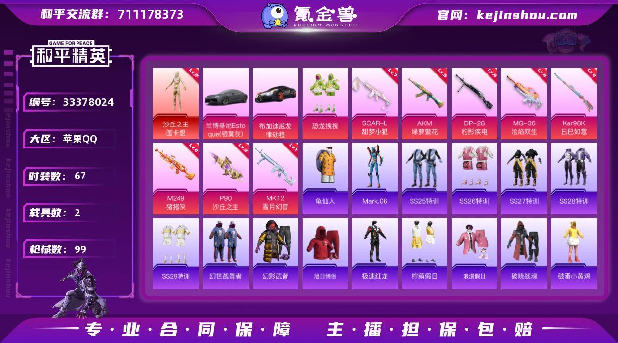 精品小号【特价出售/店主推荐--热门套装小螳螂】苹果 手Q-1神装-1粉装-9特效枪-2载具-1粉色飞行器-35614热力值-7王牌印记-67套装-99枪皮【红色神装等级】:沙丘之主-图卡盟(二级)【热门品类】:套装-龟仙人,角色-Mark.06【粉色套装】:粉装-恐龙拽拽【粉色枪皮等级】:AKM-绿萝繁花(五级),SCAR-L-甜梦小狐(七级),ACE32-萌骑漫游(四级),P90-沙丘之主(三级),Kar98K-巳巳如意(四级),MK12-雪月幻音(一级),M249-猪猪侠(四级),DP-28-豹影疾电(四级),MG-36-沧焰双生(四级)【粉色载具】:兰博基尼Estoque(银翼灰),布加迪威龙(律动橙)【粉色枪皮】:AKM-绿萝繁花,SCAR-L-甜梦小狐,ACE32-萌骑漫游,P90-沙丘之主,Kar98K-巳巳如意,MK12-雪月幻音,M249-猪猪侠,DP-28-豹影疾电,MG-36-沧焰双生【粉色飞行器】:沙丘之主天马