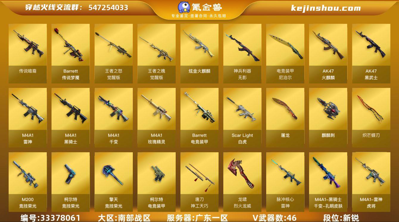 广东一区-52V-2王者武器数-1炫金武器数 【传说武器】:传说暗裔,传说梦魇 【热门武器】:传说暗裔,传说梦魇,Scar Light-白虎,M200-竞技荣光,M4A1-黑骑士*2,羊驼玩偶,裁决-雪莉杨,USP-雷暴,炽芒蝶刃*2 【王者炫金武器】:炫金火麒麟 【皮肤】:雷神-虎将,雷神-脉冲核心,火麒麟-白虎,火麒麟-心动糖果,M4A1-千变-孔明皮肤,AK47-黑武士-361,战神-流金岁月皮肤,麒麟刺-萌杀皮肤 【角色】:电竞教官-云悠悠,鹰,关小雨,晴雅,王者葵-惊若翩鸿,炽天使,嘉年华灵狐,娟娟,卡塔琳娜,葵-赛博朋克,兰妹妹,灵狐-花神,龙儿-小淘气,萌儿,斯沃特-X,兔囡囡,樱-战斗天使 【人偶武器】:裁决-雪莉杨,AWM-灵狐-15周年嘉年华,迷你裂空之翼*2,迷你牛魔王,黄金迷你裂空之翼,迷你波特博士*3,夺魂,迷你火种*2 【暴走生化】:超级对讲机 【挑战大师】:冰龙粉碎者-白马银枪,试炼破坏者III,神圣爆裂者-末日III 【英雄级武器】:M4A1-千变,AK47-火麒麟,M4A1-雷神,M4A1-黑骑士*2,AK47-黑武士,Scar Light-白虎,无影-神兵利器,M4A1-玫瑰精灵,王者之魄-觉醒版,Barrett-电竞装甲,M200-竞技荣光,王者之怒-觉醒版,USP-雷暴,柯尔特-电竞装甲,柯尔特-竞技荣光...
