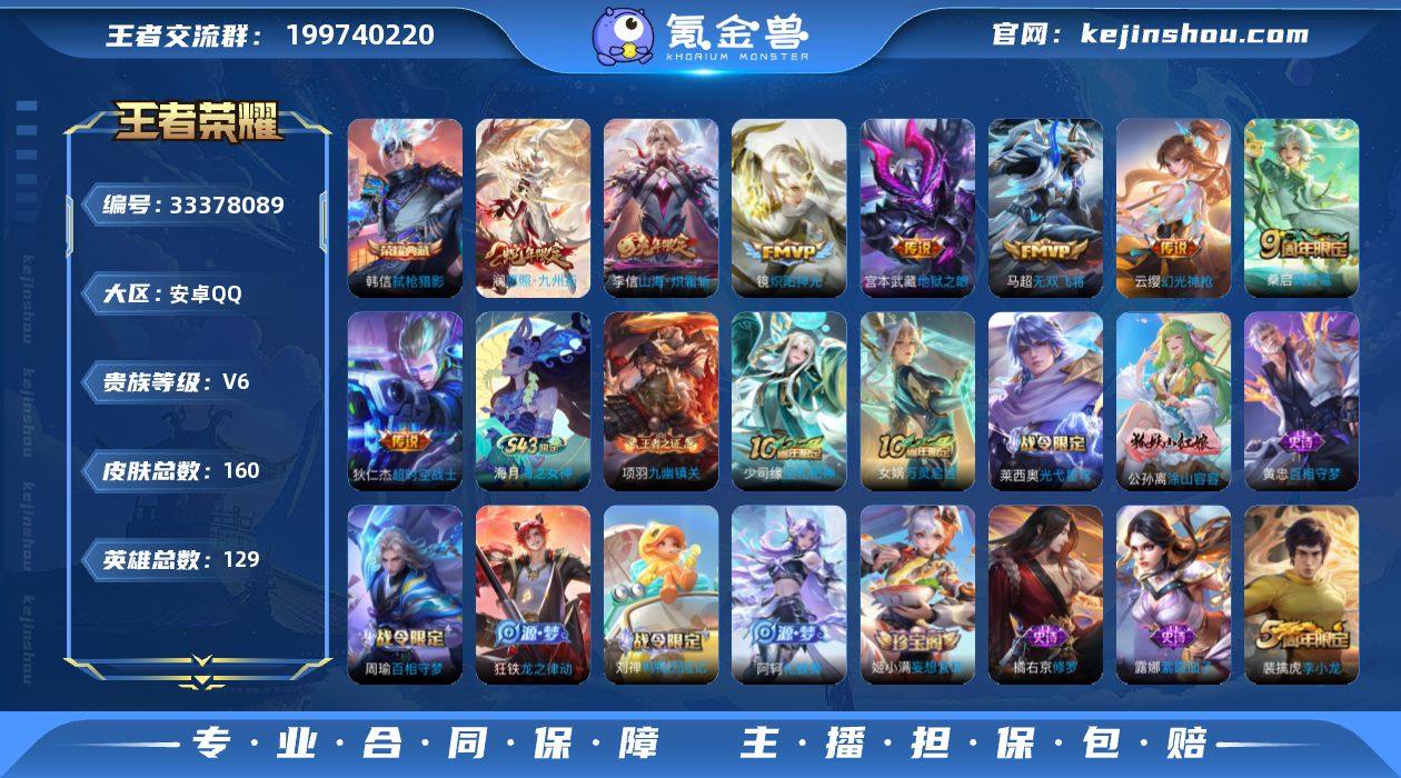 安卓Q-V6-至尊星耀V段位-129英雄-160皮肤-1典藏皮肤-8传说-43史诗HZ264117 【荣耀典藏】:韩信弑枪猎影 【传说皮肤】:澜愿照九州拓,云缨幻光神枪,桑启鸣野蒿,李信山海炽霜斩,马超无双飞将,镜炽阳神光,宫本武藏地狱之眼,狄仁杰超时空战士 【限定皮肤】:姜子牙天穹之誓,狄仁杰阴阳师,赵云皇家上将,狄仁杰魔术师,项羽海滩派对,裴擒虎李小龙,裴擒虎擒涛扼浪,李信山海炽霜斩,猪八戒西部大镖客,鲁班大师探海日志,桑启海盐诗旅,艾琳流音漫舞,阿古朵江河有灵,张良古海寻踪,鬼谷子天穹祈灯,姬小满妄想食味,刘邦剑破天穹,周瑜熔金海岸 【年限皮肤】:李信山海炽霜斩,澜愿照九州拓 【赛季限定】:桑启海盐诗旅,裴擒虎擒涛扼浪,鲁班大师探海日志,张良古海寻踪,鬼谷子天穹祈灯,刘邦剑破天穹,姜子牙天穹之誓,东皇太一噬灭天穹,太乙真人谧流熔炉,钟馗虚灵犬护,甄姬逆浪荇歌,亚瑟荣光之誓,牛魔星界战将,项羽九幽镇关 【战令限定】:猪八戒西部大镖客,艾琳流音漫舞,孙膑茶境仙,马超访茗客,刘禅鸭鸭历险记,沈梦溪鸭鸭历险记,周瑜百相守梦,孙策百相守梦,莱西奥光弋星穹,明世隐往忆晖光 【史诗皮肤】:海月海之女神,项羽九幽镇关,少司缘巫礼祀...