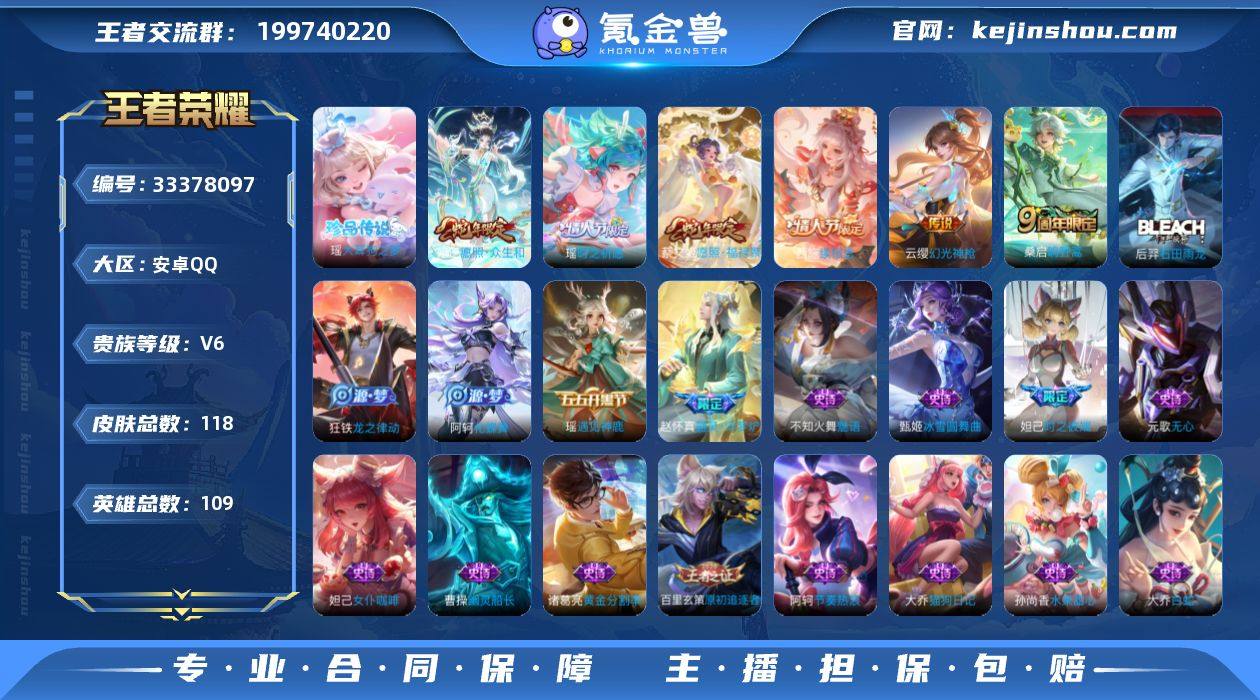 109英雄-118皮肤-安卓QQ/精品女号/大耳狗瑶情限瑶/都是高质量限定皮/至尊星耀/118皮肤/109英雄/1珍品传说/7传说/28史诗/5稀有英雄 【1 珍品传说】大耳狗之梦 瑶, 【7 传说皮肤】时之祈愿 瑶,神骥·鸣幻洲 朵莉亚,愿照·众生和 妲己,愿照·福禄聚 蔡文姬,幻光神枪 云缨,鸣野蒿 桑启,续相思 西施, 【28 史诗皮肤】猫狗日记 大乔,无心 元歌,线条小狗 周瑜,百晓客 明世隐,魅力维加斯 妲己,黄金分割率 诸葛亮,女仆咖啡 妲己,白蛇 大乔,遇见神鹿 瑶,原初追逐者 百里玄策,时之彼端 妲己,石田雨龙 后羿,魔术师 狄仁杰,龙之律动 狂铁,皇家上将 赵云,圣诞狂欢 吕布,魅语 不知火舞,器灵·浮梦炉 赵怀真,地狱岩魂 廉颇,冰雪圆舞曲 甄姬,节奏热浪 阿轲,万物之道 弈星,绅士熊喵 刘禅,缤纷独角兽 小乔,线条小狗 小乔,水果甜心 孙尚香,化蝶舞 阿轲,幽灵船长 曹操, 【61 勇者皮肤】沙漠行僧 达摩,大漠名商 沈梦溪,缤纷绘卷 张良,拳王 达摩,沉稳之力 孙尚香,白色死神 白起,阴阳师 狄仁杰,戏梦巡演 空空儿,西部大镖客 牛魔,鲨炮海盗猫 沈梦溪,海滩派对 项羽,踏浪烽翎 莱西奥,红桃皇后 芈月,野性能量 吕布,守护之力 大乔,天穹祈灯 鬼谷子,五福同心 张飞,金色潮汐 朵莉亚,东方不败 武则天,虹云星官 明世...