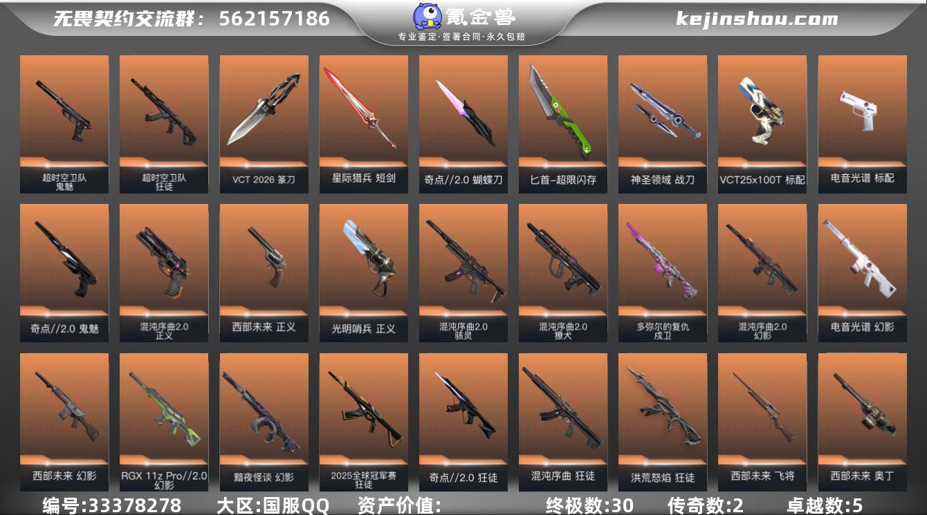 【PTWW3889】LV等级118/皮肤总价值61420/段位超凡/总皮肤数量111/刀皮数量8/枪皮数量103/套装数量4/具体详情请看图/VCT 2026 赛季套装/混沌序曲//2.0套装/西部未来/奇点//2.0套装/炼狱/维斯/暮蝶/钛狐/壹决/铁臂/捷风/雷兹/幽影/不死鸟/贤者/猎枭/蝰蛇/零/芮娜/奇乐/尚勃勒/霓虹/夜露/星礈/K/O/钢锁/VCT 2026 篆刀/混沌链枷/蝴蝶刀-奇点//2.0/镭切/未来开拓者/匕首-超限闪存/神圣领域 战刀/星际猎兵 短剑/2025全球冠军赛 狂徒/狂徒-洪荒怒焰/狂徒-混沌序曲/狂徒-奇点//2.0/狂徒-荆刺圣骸/狂徒-超时空卫队/狂徒-咒缚双界/狂徒-赤焰铁骥/幻影-黯夜怪谈/幻影-RGX 11z Pro//2.0/幻影-西部未来/幻影-电音光谱/幻影-混沌序曲2.0/幻影-超限闪存/幻影-神圣领域/多弥尔的复仇 戍卫/戍卫-浮光跃金/戍卫-逆冲蛮牛/戍卫-月球哨兵/獠犬-混沌序曲2.0/獠犬-日冕雄师/獠犬-神圣领域/獠犬-模拟赫兹/獠犬-逆冲蛮牛/冥驹-离子武器/冥驹-荒土机兵/冥驹-模拟赫兹/冥驹-星云暗涌/飞将-西部未来/莽侠-神中神罚/莽侠-超限闪存/莽侠-月球哨兵/战神-神圣领域/战神-浮光跃金/奥丁-西部未来/奥丁-纳米打击/判官-纳米打击x/雄鹿-模拟赫兹/雄鹿-逆冲蛮牛/雄鹿-月球哨兵/骇灵-混沌序曲2.0/骇灵-荒土机兵/骇灵-...