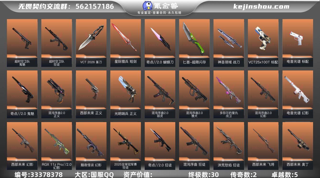 【956554】【套装】:VCT 2026 赛季套装,混沌序曲//2.0套装,西部未来套装,奇点//2.0套装 【英雄】:炼狱,维斯,暮蝶,钛狐,壹决,铁臂,捷风,雷兹,幽影,不死鸟,贤者,猎枭,蝰蛇,零,芮娜,奇乐,尚勃勒,霓虹,夜露,星礈,K/O,钢锁 【近战武器】:近战武器-VCT 2026 篆刀,近战武器-混沌链枷,近战武器-奇点//2.0 蝴蝶刀,近战武器-镭切,近战武器-未来开拓者,近战武器-超限闪存 匕首,近战武器-神圣领域 战刀,近战武器-星际猎兵 短剑 【狂徒】:狂徒-2025全球冠军赛,狂徒-洪荒怒焰,狂徒-混沌序曲,狂徒-奇点//2.0,狂徒-荆刺圣骸,狂徒-超时空卫队,狂徒-咒缚双界,狂徒-赤焰铁骥 【幻影】:幻影-黯夜怪谈,幻影-RGX 11z Pro//2.0,幻影-西部未来,幻影-电音光谱,幻影-混沌序曲//2.0,幻影-超限闪存,幻影-神圣领域,幻影-西部未来,幻影-电音光谱 【戍卫】:戍卫-多弥尔的复仇,戍卫-浮光跃金,戍卫-逆冲蛮牛,戍卫-月球哨兵 【獠犬】:獠犬-混沌序曲//2.0,獠犬-日冕雄师,獠犬-神圣领域,獠犬-模拟赫兹,獠犬-逆冲蛮牛 【冥驹】:冥驹-离子武器,冥驹-荒土机兵,冥驹-模拟赫兹,冥驹-星云暗涌 【飞将】:飞将-西部未来 【莽侠】:莽侠-神中神罚,莽侠-...