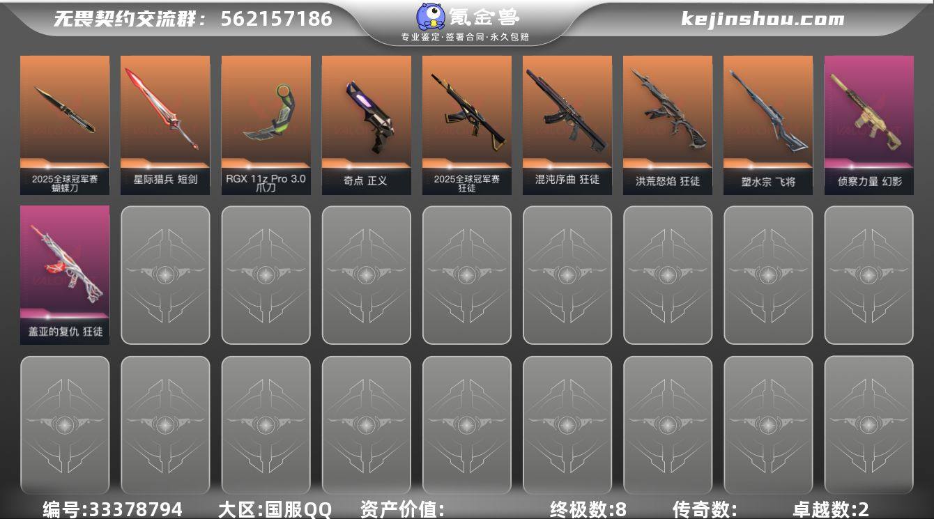 【kywwqy170】【套装】:2025全球冠军赛套装 【英雄】:幻棱,炼狱,暮蝶,壹决,捷风,雷兹,幽影,不死鸟,贤者,猎枭,蝰蛇,零,芮娜,尚勃勒,霓虹,斯凯,夜露,K/O,海神,黑梦 【近战武器】:近战武器-2025全球冠军赛 蝴蝶刀,近战武器-RGX 11z Pro//3.0 爪刀,近战武器-星际猎兵 短剑 【狂徒】:狂徒-2025全球冠军赛,狂徒-洪荒怒焰,狂徒-混沌序曲,狂徒-盖亚的复仇 【幻影】:幻影-侦察力量 【飞将】:飞将-塑水宗 【骇灵】:骇灵-无限竞技 【正义】:正义-奇点 【卡面】:无畏契约GO!第一卷:芮娜 卡面,无畏契约GO!第一卷:零 卡面,《双城之战》金克丝 卡面,代号红色 卡面,新兵报到 卡面,V契约 卡面,无畏契约 卡面 【喷漆】:买装还是存钱 喷漆,无畏契约GO!第一卷:贤者 喷漆,松叶 喷漆,胜利属于无畏契约 喷漆,GLHF 喷漆,无畏契约 喷漆 【挂饰】:鱼骨头 挂饰,天外飞客 挂饰,无畏契约 纪念币 挂饰