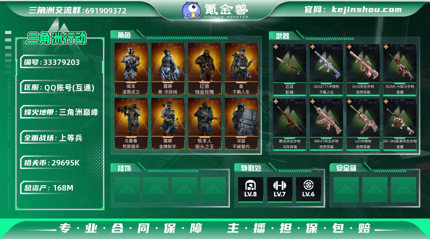 【红狼-蚀金玫瑰,露娜-黑·天际线,威龙-凌霄戍卫,威龙-铁面判官,威龙-飞虎/近战-影锋/高资产】168m总资产-29695k哈夫币-60烽火等级-三角洲巅峰-50战场等级-上等兵 【干员外观】:红狼-蚀金玫瑰,露娜-黑·天际线,威龙-凌霄戍卫,威龙-铁面判官,威龙-壮志凌云,威龙-飞虎,蜂医-送葬人·无题密令,牧羊人-街头之王,无名-夜鹰,深蓝-不破誓约,红狼-电锯惊魂,露娜-金牌射手,乌鲁鲁-荒原猎手,蛊-不羁人生 【近战皮肤】:近战-影锋,近战-黑鹰 【传说外观】:M4A1突击步枪-蚀金玫瑰,M4A1突击步枪-阿米娅,AKM突击步枪-锦绣,QBZ95-1突击步枪-破军,QBZ95-1突击步枪-凌霄戍卫,M16A4突击步枪-狩猎时刻,AUG突击步枪-悠然茶歇,M7战斗步枪-零度协议,M7战斗步枪-维京,SG552突击步枪-运动员,AK-12突击步枪-夜鹰,AK-12突击步枪-特斯拉线圈,SCAR-H战斗步枪-铁艺苍穹,SCAR-H战斗步枪-启航,SCAR-H战斗步枪-荼蘼,G3战斗步枪-狩猎时刻,G3战斗步枪-骑士,CAR-15突击步枪-黑鹰坠落,CAR-15突击步枪-阿米娅,腾龙突击步枪-马年祥瑞,K437突击步枪-锦绣,KC17突击步枪-电锯惊魂,MK47突击步枪-悠然茶歇,Vector冲锋枪-狩猎时刻,UZI冲锋枪-特斯拉线圈,UZI冲锋枪-悠然茶歇,SMG...