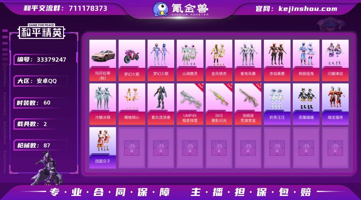 DYH18150有二次【2载具-10粉装-3特效枪 梦幻火箭】安卓手Q-2载具-10粉装-3特效枪-60套装-87枪皮-5王牌印记-英勇黄金Ⅲ-28934热力值【2载具】双人摩托-梦幻火箭,玛莎拉蒂Ghibli(粉)【10粉装】紫电风暴,角色-复仇流浪者,梦幻火箭,赤焰黑爵,闪耀律动,橘柚倾心,绚丽摇曳,金风银杏,冷魅冰骑,山涧鹿灵【3特效枪】汤姆逊-荒漠赏金[4级],SKS-碧影闪光[6级],UMP45-相思残雪[4级]【134其它衣服和枪皮】音速流光,玉兔迎春,滨海假日,奶芙汪汪,湖蓝色名流,黑色伏地魔,SS17特训,沁蓝冰爽,牛气冲天,霓虹极客,虎虎生威吉莉,极地朋克,特战英豪,焰山流火,SS18特训,幻世战舞者,炫蓝之夏,异彩先驱,飞驰魅影,SS20特训,冷焰舞者,恶魔喵喵,娇憨猪猪,绮丽涂鸦,萌趣咩咩,覆海蛟龙,霓虹街区,SS21特训,智慧隐士,瑞龙福将,微雨春柳,酒红色名流,落日神探,粉团憨憨,空投萌叽,SS19特训,夏雨游龙,探宝勇士,特殊使命,虚音幻奏,长空猛禽,团圆交子,竞技名士,牛气满满,SS25特训,夏日音浪,福星高照,甜心亚梦,深蓝色名流,魅力单车,Mk14-相思残雪,AKM-灼热熔岩,AUG-幻梦音符,MG3-瑞龙福将,Mini14-梦幻火箭,AKM-虎虎生威,平底锅-娇憨猪猪,Mk47-林间仙鹿,GROZA-异彩先驱,Mini14-异彩先驱,Kar98K-彩虹符号,SLR-娇憨猪猪,P1...