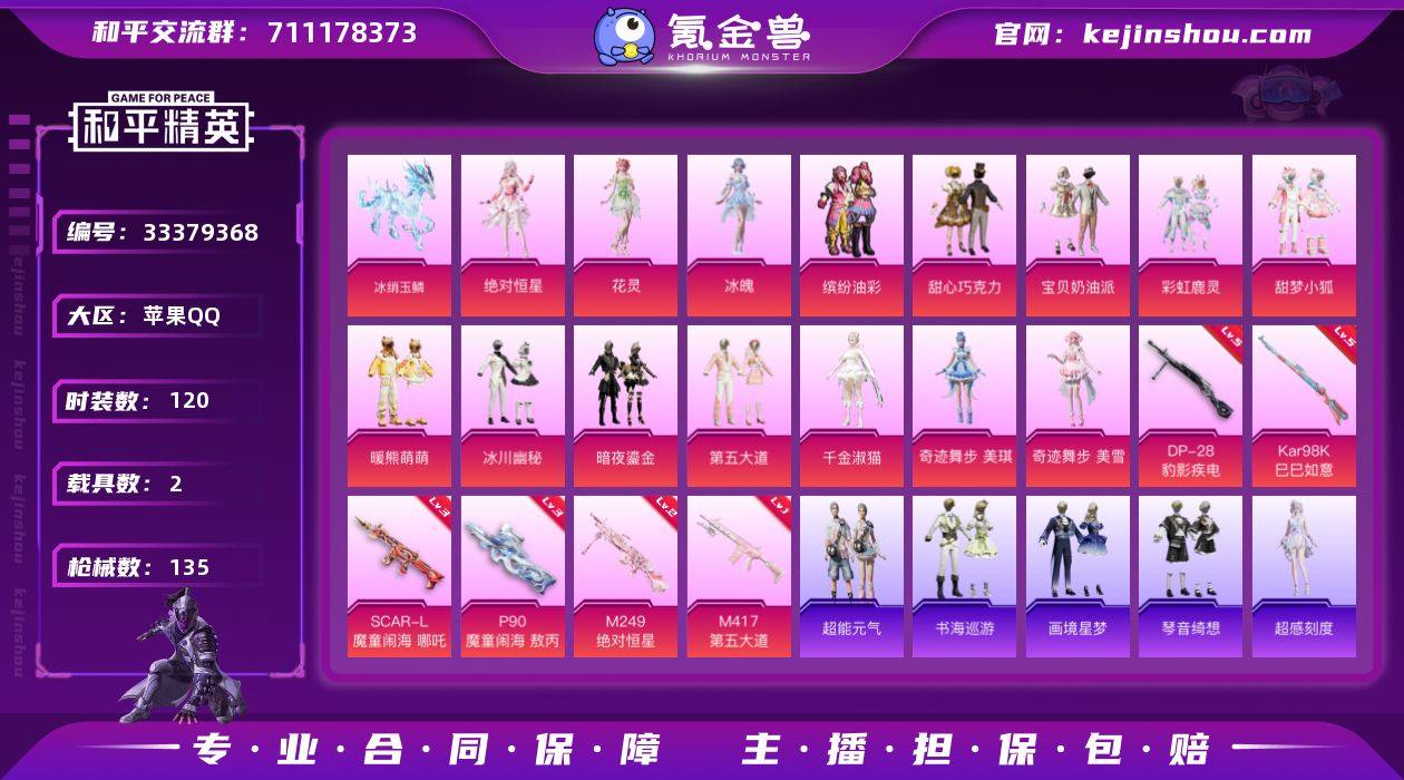 苹果 手Q-1神装-15粉装-6特效枪-2载具-7粉色飞行器-49375热力值-5王牌印记-120套装-135枪皮 【红色神装等级】:暮色玫影-艾丽娅(二级) 【红色角色神装】:暮色玫影-艾丽娅 【热门品类】:粉装-缤纷油彩,套装-浪漫天命,套装-潮萌小黄鸭,套装-暗影哥特,套装-糯粉咩咩,套装-软软马卡龙,套装-红熊茄茄 【粉色套装】:角色-绝对恒星,粉装-甜心巧克力,粉装-宝贝奶油派,粉装-缤纷油彩,粉装-彩虹鹿灵,粉装-甜梦小狐,粉装-暖熊萌萌,粉装-冰川幽秘,粉装-暗夜鎏金,粉装-第五大道,角色-千金淑猫,角色-奇迹舞步 美琪,角色-奇迹舞步 美雪,角色-花灵,角色-冰魄 【粉色枪皮等级】:SCAR-L-魔童闹海 哪吒(三级),P90-魔童闹海 敖丙(三级),Kar98K-巳巳如意(五级),M417-第五大道(一级),M249-绝对恒星(二级),DP-28-豹影疾电(五级) 【粉色载具】:僚机-冰龙团团,冰绡玉鳞,暮色幽蹄 【粉色枪皮】:SCAR-L-魔童闹海 哪吒,P90-魔童闹海 敖丙,Kar98K-巳巳如意,M417-第五大道,M249-绝对恒星,DP-28-豹影疾电 【粉色飞行器】:绝对恒星飞行器,炫彩糖果飞行器,沙丘之主天马,飞天猪飞行器,灵珠游龙飞行器,暮色之舞飞行器 【粉色降落伞】:绝对恒星降落伞,甜心宝贝降落...
