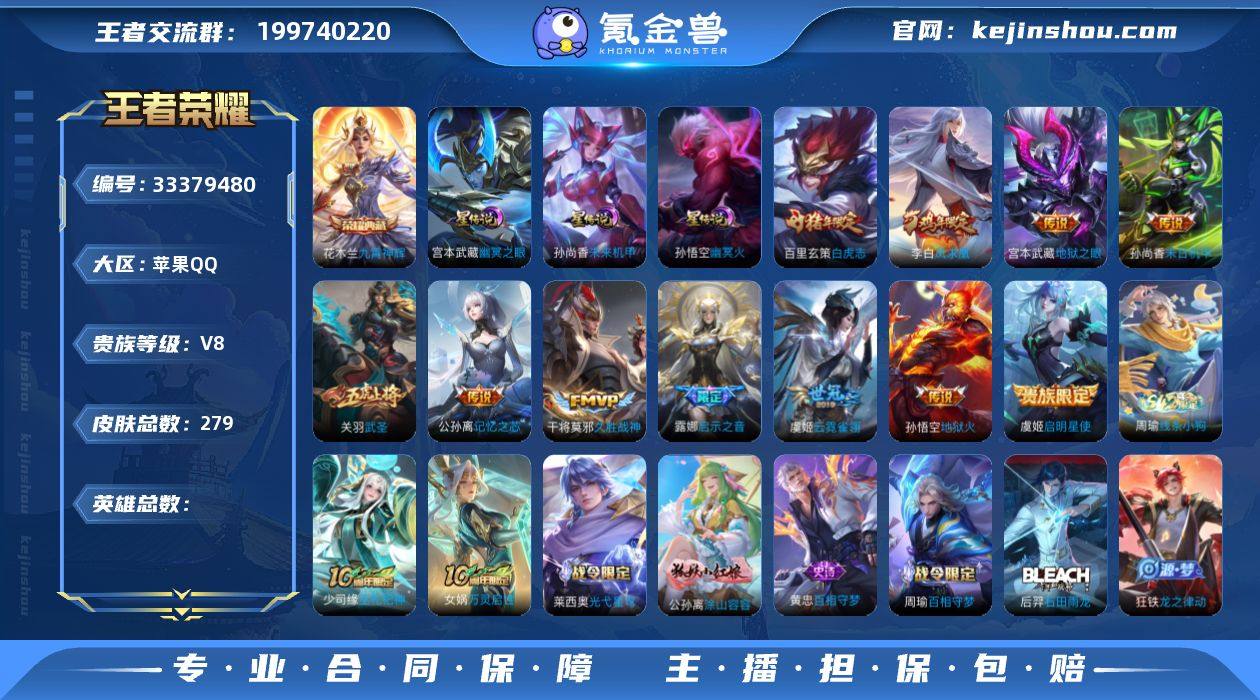 MCK633965 【木兰典藏!白虎志!武圣!】 皮肤数量279 印记总数11 【V8】 【永恒钻石】 【可修改】 账号类型2 荣耀典藏1 星元皮肤3 传说11 史诗77 账号类型:打野号,上单号; 荣耀典藏:花木兰_九霄神辉; 星元皮肤:宫本武藏_幽冥之眼,孙尚香_未来机甲,孙悟空_幽冥火; 传说:孙悟空_地狱火,宫本武藏_地狱之眼,干将莫邪_久胜战神,虞姬_启明星使,露娜_启示之音,关羽_武圣,孙尚香_末日机甲,虞姬_云霓雀翎,公孙离_记忆之芯,李白_凤求凰,百里玄策_白虎志; 史诗:海月_海之女神,嬴政_暗夜贵公子,周瑜_线条小狗,廉颇_地狱岩魂,米莱狄_胡桃异想国,莱西奥_光弋星穹,少司缘-巫礼祀神,女娲-万灵启世,司马懿_暗渊魔法,公孙离_涂山容容,元歌_云间偶戏,黄忠-百相守梦,亚瑟_心灵战警,周瑜_百相守梦,狂铁_龙之律动,雅典娜_黎明之约,后羿_石田雨龙,鬼谷子_五谷丰年,兰陵王_暗隐猎兽者,刘禅_绅士熊喵,张飞_乱世虎臣,宫本武藏_鬼剑武藏,夏洛特_永昼,嬴政_优雅恋人,曹操_幽灵船长,孙策_猫狗日记,韩信_傲雪梅枪,夏侯惇_乘风破浪,嫦娥_拒霜思,花木兰_水晶猎龙者,庄周_高山流水,猪八戒_猪悟能,百里玄策_原初追逐者,老夫子_航海奇遇记,孙尚香_水果...