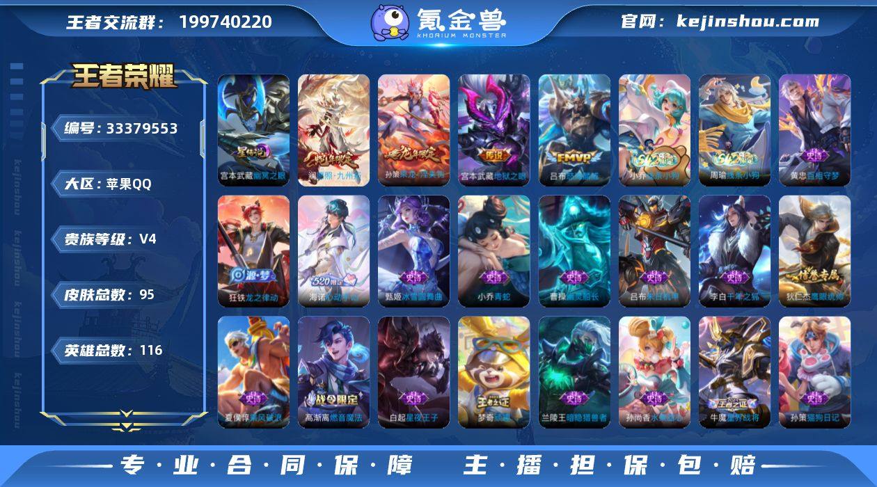 贵族等级: V4 英雄数: 116 皮肤数: 95 星传说: 幽冥之眼 传说皮: 地狱之眼,乘龙·淬吴钩 限定皮: 怒海麟威,愿照·九州拓