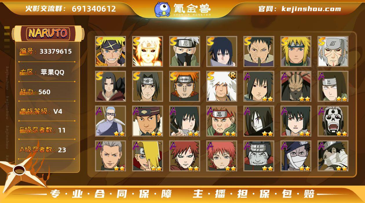 DHY810【可二次 S忍者11 A忍者23 通灵14】【苹果Q-687区-141级-V4-560万战力】【S级数量】11【A级数量】23【B级数量】45【C级数量】43【S级】漩涡鸣人·宇智波佐助 自来也「舞之豪杰」 宇智波带土「忍界大战」 波风水门 佩恩「天道」 旗木卡卡西「须佐能乎」 宇智波佐助「永恒万花筒」 宇智波鼬「须佐能乎」 波风水门「九喇嘛连结」 宇智波鼬「秽土转生」 千手扉间「秽土转生」【A级】千代「近松十人卫」 波风水门「青年」 小南「神驹佑将」 秋道丁次「忍界大战」 我爱罗「疾风传」 宇智波佐助「万花筒写轮眼」 桃地再不斩「秽土转生」 长十郎「六代目水影」 宇智波泉奈 日向宁次「忍界大战」 蝎 迈特凯「青春爆炸」 宇智波鼬 迪达拉 蝎「绯流琥」 干柿鬼鲛 飞段 猿飞阿斯玛 飞段「死司凭血」 大蛇丸「晓」 旗木卡卡西「幻之真容」 宇智波鼬「夏日限定」 宇智波佐助「须佐能乎」【B级】枫「新佩恩六道」 白 油女志乃「疾风传」 李洛克「疾风传」 君麻吕「漂泊浪客」 天天「疾风传」 佩恩「人间道」 山中井野「疾风传」 夕日红 雨琉「羁绊」 御手洗红豆「新春限定」 惠比寿 大和「暗部」 宇智波鼬「暗部」 春野樱「忍者少女」 卯月夕颜 旗木卡卡西「暗部」 宇智波鼬「红夜之刃」...