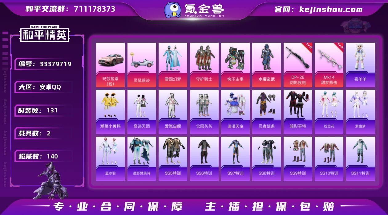 安卓 手Q-5粉装-6特效枪-2载具-1粉色飞行器-46268热力值-4王牌印记-131套装-140枪皮 【热门品类】:粉装-雪国幻梦,套装-浪漫天命,套装-忍者信条,套装-SS1特训,套装-潮萌小黄鸭,套装-暗影哥特 【粉色套装】:粉装-守护骑士,粉装-快乐主宰,粉装-水曜玄武,粉装-雪国幻梦,角色-鸢尾珑雾 【粉色枪皮等级】:ACE32-萌骑漫游(四级),AKS-74U-森灵之息(五级),Mk14-甜梦熊击(五级),Mk14-福马献瑞(五级),AA12-G-萌骑幻想(三级),DP-28-豹影疾电(五级) 【粉色载具】:玛莎拉蒂Ghibli(粉),灵鼠银迹 【粉色枪皮】:ACE32-萌骑漫游,AKS-74U-森灵之息,Mk14-甜梦熊击,Mk14-福马献瑞,AA12-G-萌骑幻想,DP-28-豹影疾电 【粉色飞行器】:炫彩糖果飞行器 【粉色降落伞】:深海曼妙降落伞,银河战甲降落伞,甜心宝贝降落伞,雪国幻梦降落伞,春暖花开降落伞,天启纪元降落伞,四圣焕新降落伞,幻彩电音降落伞,喜羊羊与灰太狼降落伞,异瞳寒姬降落伞,炫彩糖果降落伞 【稀有套装】:套装-炫彩糖果,套装-马上有钱,套装-粉恋花,套装-紫幽梦,套装-蓝冰羽,套装-星影赞美诗,玩偶服-喜羊羊,套装-雨过天青,套装-红釉青花 【稀有枪皮】:AKM-夜灯,AKM-春暖花开,AKM-虎虎生威,...