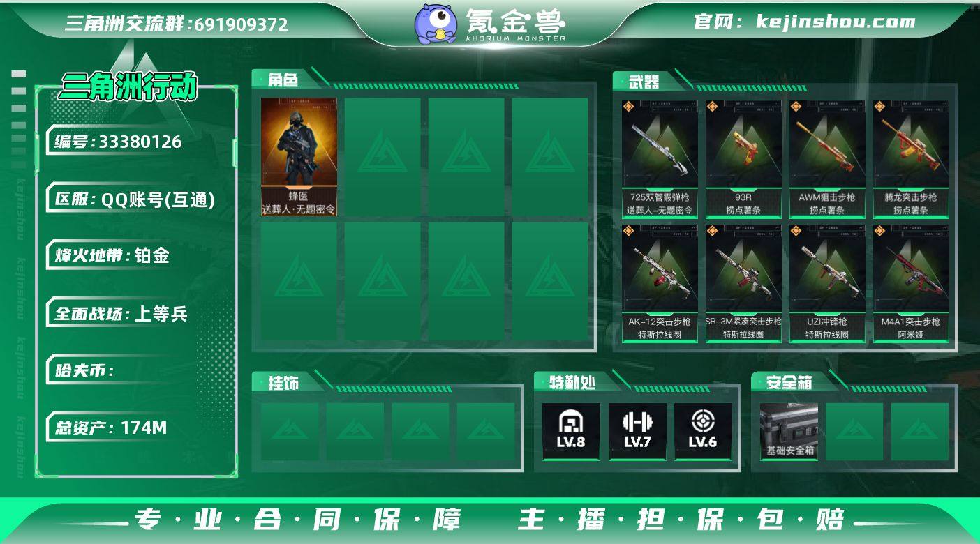 总资产:174.1M 4干员外观 3近战传说 32传说枪械 哈夫币:54.801K 不可修改实名 高级安全箱4.15到期 【烽火地带段位】钻石 【全面战场段位】上等兵 【干员外观】红狼-电锯惊魂,蜂医-送葬人·无题密令(S5),深蓝-不破誓约(S6),露娜-金牌射手(S7) 【传说武器皮肤】近战武器-处刑者,近战武器-暗星,近战-电锯惊魂,K416突击步枪-命运(典藏),M7战斗步枪-巳蛇,G3战斗步枪-骑士,AWM狙击步枪-捞点薯条,腾龙突击步枪-捞点薯条,93R-捞点薯条,AK-12突击步枪-特斯拉线圈,SR-3M紧凑突击步枪-特斯拉线圈,UZI冲锋枪-特斯拉线圈,勇士冲锋枪-能天使-午夜邮差,M250通用机枪-骑士之心,S12K霰弹枪-电锯惊魂,M14射手步枪-电锯惊魂,SCAR-H战斗步枪-启航,ASh-12战斗步枪-鹅鸭杀,QCQ171冲锋枪-鹅鸭杀,QJB201轻机枪-鹅鸭杀,KC17突击步枪-电锯惊魂,SG552突击步枪-运动员,47突击步枪-悠然茶歇,AUG突击步枪-悠然茶歇,UZI冲锋枪-悠然茶歇,SKS射手步枪-骑士,M14射手步枪-蛮荒,M4A1突击步枪-蚀金玫瑰,725双管霰弹枪-送葬人-无题密令,M4A1突击步枪-阿米娅,CAR-15突击步枪-阿米娅,复合弓-黑-天际线