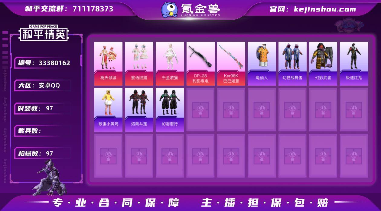 【956615】DYH18140安卓手Q-3粉装-5特效枪-97套装-97枪皮-9王牌印记-不朽星钻Ⅴ-31089热力值【3粉装】桃夭倾城,蜜语绒猫,角色-千金淑猫【5特效枪】Kar98K-巳巳如意[4级],UMP45-萌骑冒险[2级],Mk14-福马献瑞[5级],DP-28-豹影疾电[3级],信号枪-金乌曜日[5级]【6飞行器】马上有福飞行器,荒原烈焰飞行器,炫彩糖果飞行器,登顶巅峰飞行器,云朵驼驼飞行器,光之冒险尾迹【186其它衣服和枪皮】白色伏地魔,大橘大利,空岛之星,角色-糖霜甜心,蓝彩潮人,光之冒险,SS36特训,SS38特训,破晓战魂,焰鹰斗篷,龟仙人,角色-魂电,海岛探路者,晨曦薄雾,街头风暴,飞行日记,老实芭蕉,粉日山川,猎鹰,SS35特训,红釉青花,长空猛禽,幻世战舞者,潮流炫酷,马上来财,绯格组合,耀眼新星,耀粉歌者,香桃花海,黑色伏地魔,萌黄之夏,雨林探路者,SS34特训,竞技名士,元素星魂,柠萌假日,冰河战士,福马献瑞,SS24特训,角色-都市丽猫,SS31特训,丛林猎人,龙的传人,玉兔迎春,和煦暖阳,春光漫游,SS37特训,幻影武者,炫彩糖果,魅力单车,坚韧舞者,SS28特训,沙漠兵团,破蛋小黄鸡,快闪甜心,狙击之神,SS23特训,惊鸿侠骨,黄色伏地魔,极速红龙,白糯汤圆,云魄琉璃,SS29特训,雪国风尚,SS20特训,SS25特训,锦衣飞扬,轻风白浪,雨过天青,SS21...