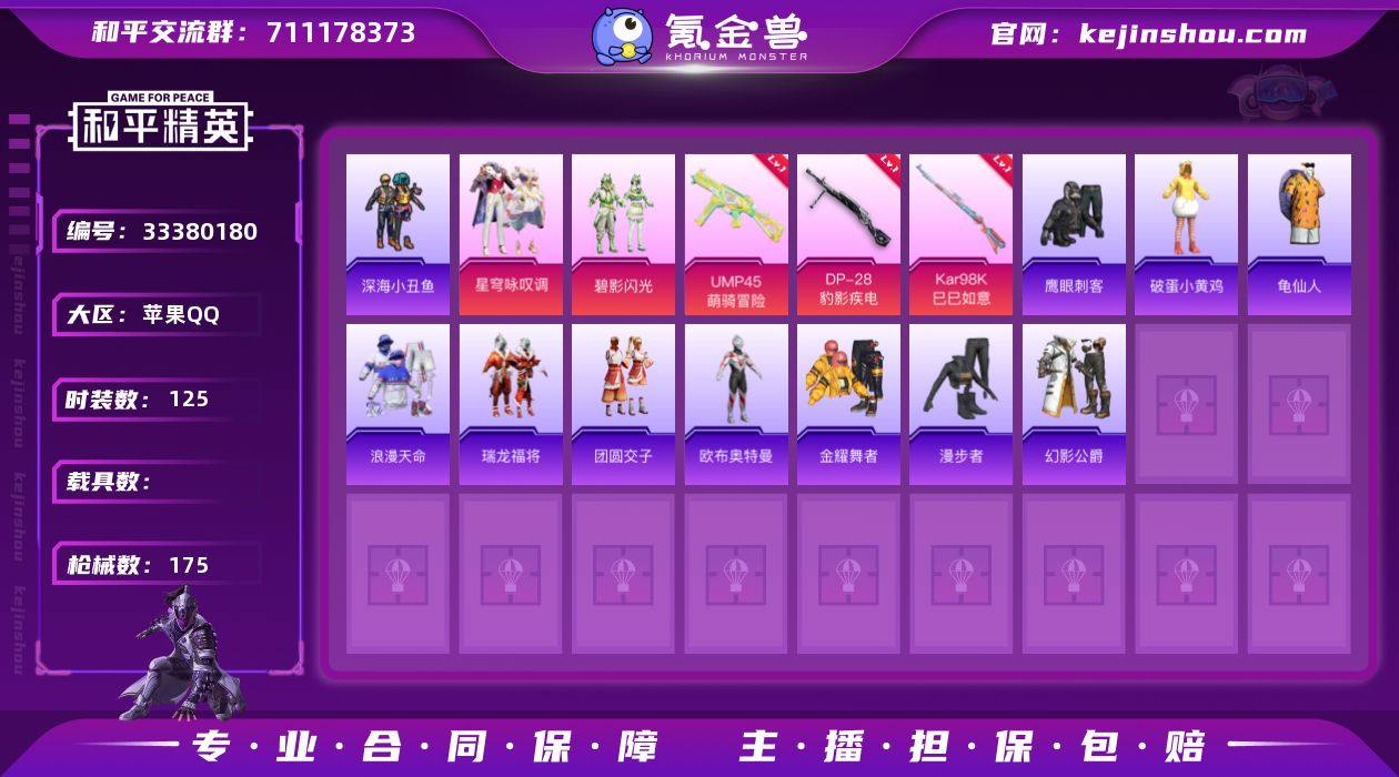 DYH18139【2粉装-4特效枪深海小丑鱼,浪漫天命】苹果手Q-2粉装-4特效枪-125套装-175枪皮-6王牌印记-不朽星钻Ⅳ-48534热力值【2粉装】星穹咏叹调,碧影闪光【4特效枪】Mk14-福马献瑞[5级],DP-28-豹影疾电[5级],Kar98K-巳巳如意[5级],UMP45-萌骑冒险[5级]【3稀有】深海小丑鱼,浪漫天命,M24-奇异狩猎者【5飞行器】破刃行动尾迹,天之羽翼飞行器,顶峰精英尾迹,异域银装飞行器,红色滑翔尾迹【1头盔】深海小丑鱼头盔【2背包】萌熊伴侣背包,幻影战神背包【291其它衣服和枪皮】千禧之恋,薄荷星砂,幻影公爵,福星高照,SS22特训,龙魂突击队,香桃花海,SS35特训,角色-军刀雅典娜,鹰眼刺客,涂山之恋,SS34特训,夏日音浪,蓝色运动,耀粉歌者,龙的传人,蓝调潮人,甜蜜熊情侣,魅力单车,玩偶服-懒羊羊,玉兔迎春,角色-欧布奥特曼,青春冒险家,SS30特训,冰川谧蓝,鹤鸣,冰河战士,野性山猫,空岛之星,柠萌假日,沙漠兵团,冰川特警,特战英豪,海盐绵绵冰,光之冒险,长空猛禽,SS33特训,黑色伏地魔,空投萌叽,SS26特训,牛气冲天,SS24特训,沙漠毒蛇,狙击之神,元气之梦,黎明保卫者,龟仙人,黄色运动,田园牧歌,破蛋小黄鸡,SS21特训,红釉青花,战术大师,黄色名流,青涩时光,SS32特训,顶瓜瓜,SS19特训,探宝勇士,龙腾端午,智慧...
