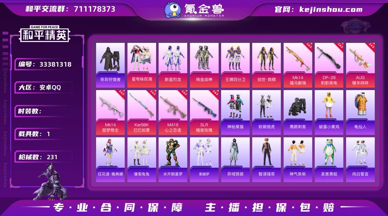 XS11538【1载具-5粉装-7特效枪 AUG-暖羊咩咩[5级]奇异狩猎者 新星烈龙】安卓手Q-1载具-5粉装-7特效枪-191套装-231枪皮-14王牌印记-坚韧铂金Ⅲ-73442热力【1载具】合金龙骨(蓝)【5粉装】星穹咏叹调,新星烈龙,王牌四分卫,创世·救赎,绚金战神【7特效枪】AUG-暖羊咩咩[5级],Mk14-甜梦熊击[5级],DP-28-豹影疾电[5级],Kar98K-巳巳如意[5级],M416-心之恋语[7级],SLR-暗夜玫瑰[7级],Mk14-福马献瑞[5级]【4稀有】奇异狩猎者,汤姆逊-奇异狩猎者,AKM-奇异狩猎者,AKM-百万伏特【8飞行器】登顶巅峰飞行器,顶峰精英尾迹,异域银装飞行器,炫彩糖果飞行器,鸡智如我飞行器,破刃行动尾迹,狂鲨锋刃飞行器,星之信仰飞行翼【3头盔】甜蜜誓约头盔,甜心宝贝头盔,国宝胖达头盔 【4背包】古堡领主背包,甜蜜誓约背包,深海小丑鱼背包,九霄背包 【406其它衣服和枪皮】甜蜜告白,玩偶服-卖崽青蛙,神气柴柴,绮丽涂鸦,SS31特训,白糯汤圆,SS23特训,飞行日记,玉兔迎春,懵萌河马,云朵鹅,顶瓜瓜,炫彩糖果,SS29特训,酷潮明星,极速红龙,SS14特训,团圆交子,战地督导,竞技达人朋克,SS19特训,格斗先锋,棉花软糖,特战装甲,角色-猎影月神,军械专家,SS9特训,滨海假日,龙的传人,特训学院,灵蜜圈圈,银白舞王,SS33特训,牛气冲...