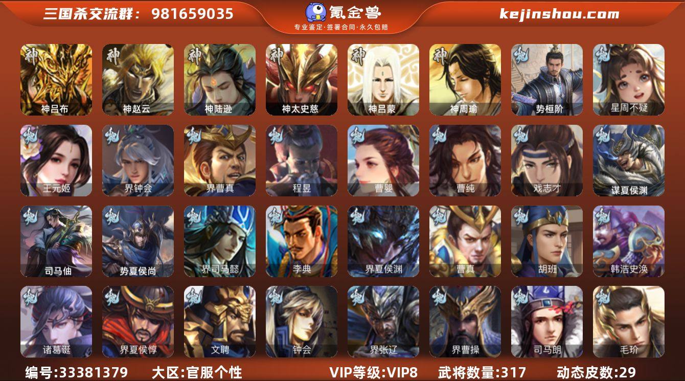 【JYSGS129】官阶:大将军 VIP等级:VIP8级 史诗武将数:39 动态皮肤数:29 武将总数:317 史诗宝珠数:8 元宝数:1101 将魂数:1664