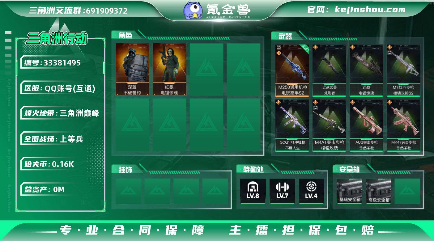 实名: 可修改 烽火地带段位: 三角洲巅峰 全面战场段位: 上等兵 总资产: 49 哈夫币: 166 干员外观: 深蓝-不破誓约(S6),红狼-电锯惊魂 传说武器皮肤: M4A1突击步枪-棱镜攻势(典藏),M4A1突击步枪-阿米娅,CAR-15突击步枪-阿米娅,Vector冲锋枪-狩猎时刻,G3战斗步枪-狩猎时刻,M16A4突击步枪-狩猎时刻,AK-12突击步枪-特斯拉线圈,SR-3M紧凑突击步枪-特斯拉线圈,UZI冲锋枪-特斯拉线圈,勇士冲锋枪-能天使-午夜邮差,M7战斗步枪-棱镜攻势S2(典藏),近战-电锯惊魂,S12K霰弹枪-电锯惊魂,M14射手步枪-电锯惊魂,R93狙击步枪-维什戴尔,SCAR-H战斗步枪-启航,ASh-12战斗步枪-鹅鸭杀,QCQ171冲锋枪-鹅鸭杀,QJB201轻机枪-鹅鸭杀,G3战斗步枪-骑士,KC17突击步枪-电锯惊魂,SKS射手步枪-骑士,近战-处刑者,M14射手步枪-蛮荒,SMG-45冲锋枪-锦绣,K437突击步枪-锦绣,AKM突击步枪-锦绣,MK47突击步枪-悠然茶歇,AUG突击步枪-悠然茶歇,UZI冲锋枪-悠然茶歇,QCQ171冲锋枪-不羁人生 亮点: 【优质装备】:M4A1突击步枪-棱镜攻势(典藏)