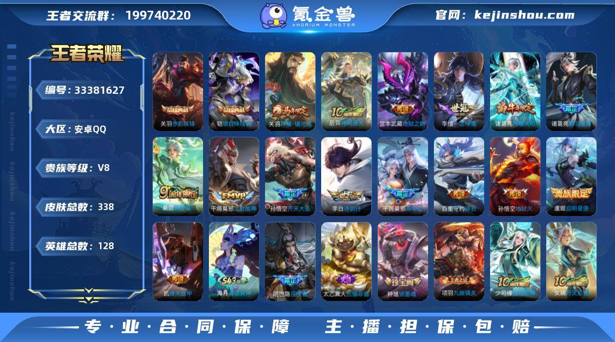 【王者荣耀】珍品无双0 典藏2 无双0 珍品传说0 传说17 史诗91 英雄128 皮肤338 贵族7级 荣耀典藏:银白咏叹调|赤影疾锋__传说皮肤:鸣野蒿|绛天战甲|启明星使|地狱之眼|地狱火|久胜战神|一念神魔|鹤羽星尊|画中仙|孙尚香-末日机甲|齐天大圣|诗剑行|时雨天司|碎云|战鼓燎原|神树通天|神骥·镇沧海__稀有限定:朱雀志|岱宗|神威|傲雪梅枪|李小龙|梁祝|时之彼端|拒霜思|暗影游猎|百解令|百里守约-真我赫兹|冰锋战神|冰霜恋舞曲|大漠名商|地狱燃心|高山流水|古海寻踪|海滩派对|海盐诗旅|航海奇遇记|胡桃异想国|皇家上将|混沌棋|剑破天穹|江河有灵|金庭之子|镜-真我赫兹|决胜骁骑|狂想玩偶喵|黎明之约|魔术师|花木兰-默契交锋|奇幻香踪|千军破阵|擒涛扼浪|青焰无极|驱傩正仪|荣光圣徽|沙漠行僧|朔风刀|探海日志|醍醐杖|天穹祈灯|玩趣恶龙|万华元夜|无心|五谷丰年|纤云弄巧|星界游侠|星空之诺|演武夺筹|疑决卦|阴阳师|银河之约|优雅恋人|驭风魔法|遇见飞天|原初追逐者|云间偶戏|真爱魔法|逐梦之影|暗隐猎兽者|缤纷独角兽|冰雪圆舞曲|乘风破浪|德古拉伯爵|地狱岩魂|电玩·爆裂旋风|功夫厨神|鬼剑武藏|箭羽风息|节奏热浪|金属风暴|魅力维加斯|魅语|梦奇-顽趣|女仆咖啡|偶像歌手|圣诞狂欢|圣...