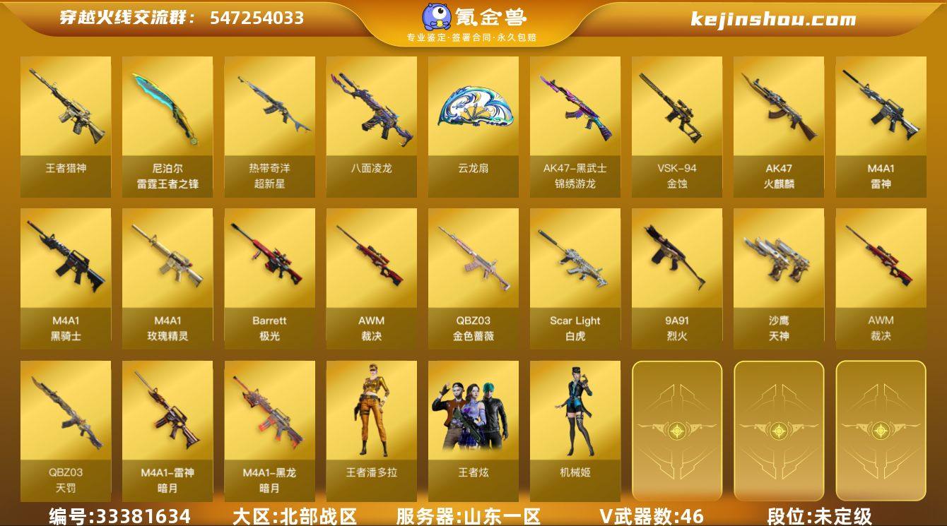 山东一区-47V-6王者武器数-1炫金武器数 【热门武器】:QBZ03-金色蔷薇,Scar Light-白虎,八面凌龙,QBZ03-街机,Cat-刀锋,M4A1-黑骑士,5-炽火炎龙,炼狱-秦师 【王者炫金武器】:王者青龙,王者猎神,雷霆王者之锋,炫金武士 【音效卡】:QBZ03-天罚音效卡,M4A1-黑骑士音效卡,炼狱-百战金芒-庆典舞曲音效卡,死神-雪域霜狐-怀旧音效卡 【皮肤】:裁决-典雅胡桃 皮肤,雷神-暗月,雷神-脉冲核心,雷神-维纳斯皮肤,M4A1-再燃火线,黑龙-暗月,黑骑士-典雅胡桃 皮肤,轻型军用手斧-再燃火线 【角色】:机械姬,战地猎狐,王者炫,王者潘多拉,雪域霜狐,奇洋探员,乔伊教练,修道士,云海玲珑,葵-阿尔法武装,暗夜-X,芳心审判者,兰-海滩派对,兰妹妹,灵狐者-X,灵狐者-黄金海岸,龙儿,麻雀,潘多拉-X,潘多拉-甜心教官,新娜塔莎,智影,潘多拉-N 【人偶武器】:炼狱-秦师,星神-炽天使,天龙-乔伊教练,超新星-枪娘安琪儿,金色蔷薇-枪娘阿敏,迷你钢铁终结者,5-炽火炎龙,海滩汪汪-巴雷特,M37-葵,Cat-刀锋,迷你生化手雷,生化手雷-机甲核心,巴雷特-赏金猎人,迷你超能女侍,灵狐娃娃手雷 【暴走生化】:黑龙吞噬者,超级对讲机 【挑战大师】:激光毁灭者III-白...