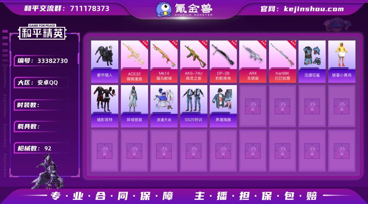 WJ892【一体号6特效枪浪漫天命,都市猎人,暗影哥特 连体火影忍者 V8 3419区 11S 18A 13通灵】安卓手Q-6特效枪-45套装-92枪皮-4王牌印记-荣耀皇冠Ⅱ-23780热力值【6特效枪】ACE32-萌骑漫游[3级],AKS-74U-森灵之息[5级],Kar98K-巳巳如意[5级],DP-28-豹影疾电[5级],ARX-无垠阁[7级],Mk14-福马献瑞[5级]【3稀有】浪漫天命,都市猎人,暗影哥特【6飞行器】炫彩糖果飞行器,登顶巅峰飞行器,异域银装飞行器,狂鲨锋刃飞行器,鸡智如我飞行器,马上有福飞行器【1头盔】深海小丑鱼头盔【128其它衣服和枪皮】战术大师,黄色名流,炫彩糖果,旭日情侣,香桃花海,SS25特训,长空猛禽,SS33特训,青翼流星,黑色伏地魔,魅力单车,狂鲨锋刃,午间小调,吉莉礼服,狙击之神,迅捷狂鲨,风迹短诗,异域银装,SS38特训,破蛋小黄鸡,福马献瑞,萌鸡速递,秘语星愿,粉黛兰香,元气之梦,王牌教练,SS35特训,雪国风尚,玲珑侠影,SS37特训,街头潮人,湖蓝色名流,角色-绯色魅影,SS34特训,幻世战舞者,迅捷龙虾,竞技名士,薄荷星砂,SS36特训,角色-月烬之祷,马上有钱,弄潮海豚,汤姆逊-耀粉歌者,AUG-耀粉歌者,SKS-糯团青竹,Mk47-风迹短诗,破片手榴弹-爆破雪人,M416-红色方程式,Mk14-冰河战士,电击枪-辉云木星,AKM-龙的传人,GROZA-福马献瑞,...