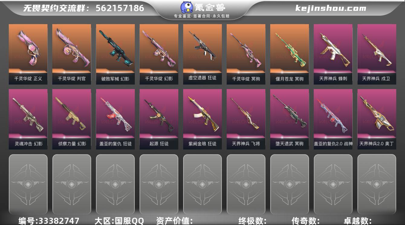 【sf223】【套装】:创·纪元套装,千灵华绽套装,天界神兵套装,魄月玄兔套装 【英雄】:幻棱,炼狱,维斯,暮蝶,钛狐,壹决,铁臂,捷风,雷兹,幽影,不死鸟,贤者,猎枭,蝰蛇,零,芮娜,奇乐,尚勃勒,霓虹,斯凯,夜露,星礈,K/O,海神,盖可,黑梦,钢锁 【近战武器】:近战武器-落英飞旋,近战武器-镭切,近战武器-珍珠棘贝 短剑,近战武器-流星兵团 短剑,近战武器-超能偶像 应援棒,近战武器-弧光异彩 军刀,近战武器-魄月玄刃,近战武器-天玄刀,近战武器-诡秘蛇影 军刀 【狂徒】:狂徒-奇点//2.0,狂徒-创·纪元,狂徒-虚空遗器,狂徒-盖亚的复仇,狂徒-起源,狂徒-紫阙金琅,狂徒-超能偶像,狂徒-弧光异彩,狂徒-流星兵团,狂徒-魄月玄兔,狂徒-诡秘蛇影 【幻影】:幻影-破败军械,幻影-千灵华绽,幻影-灵魂冲击,幻影-侦察力量,幻影-噬源兽防卫工程,幻影-珍珠棘贝,幻影-聚合之力,幻影-末日之翼 【戍卫】:戍卫-天界神兵,戍卫-超能偶像,戍卫-珍珠棘贝,戍卫-彩梦之城,戍卫-浮光跃金,戍卫-晶态集成,戍卫-战术熊与伙伴们,戍卫-折光棱晶 【獠犬】:獠犬-弧光异彩,獠犬-采蜜小蜂队,獠犬-复古浪潮 【冥驹】:冥驹-千灵华绽,冥驹-偃月苍龙,冥驹-堕天遗...
