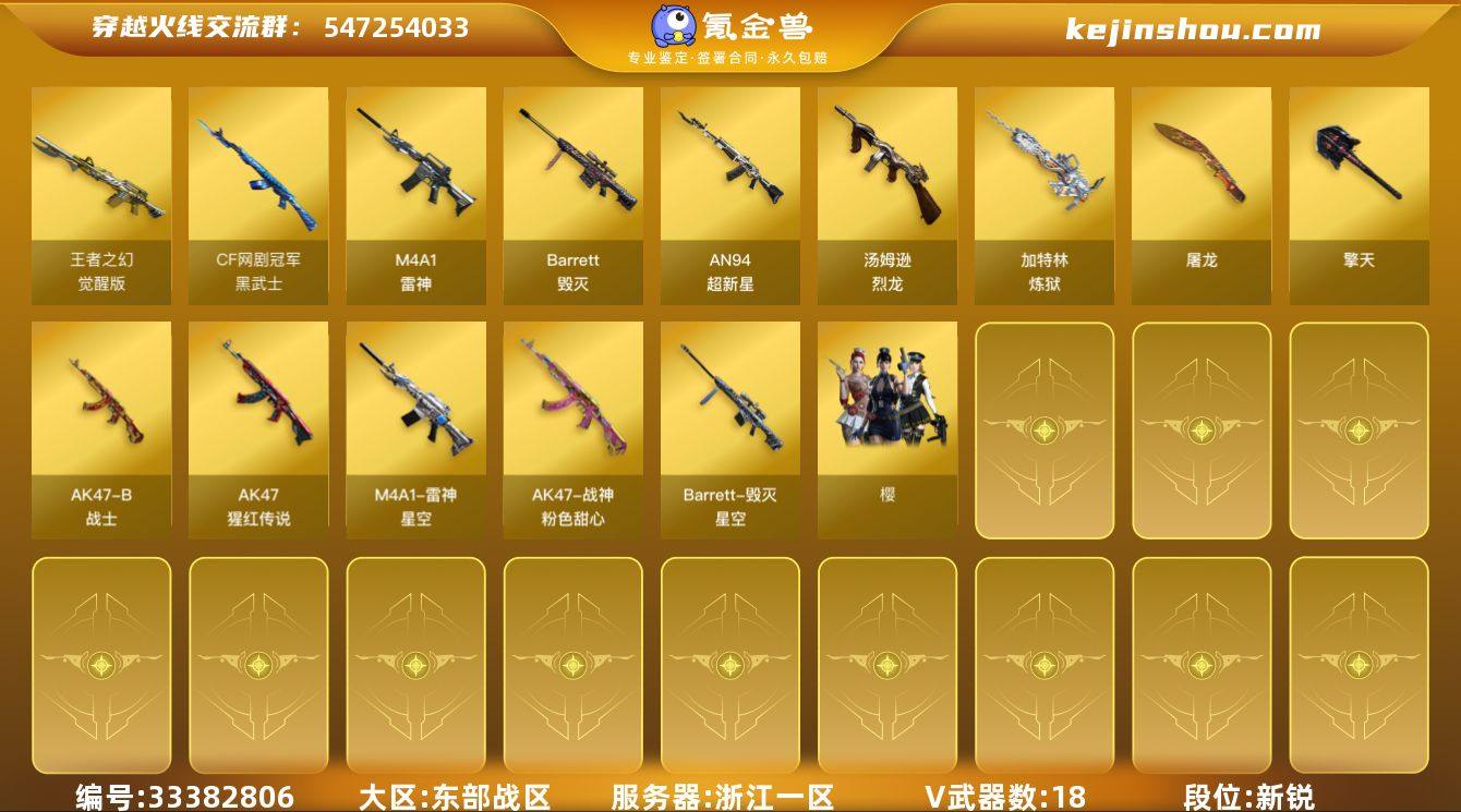 浙江一区-20V-1王者武器数-0炫金武器数 【热门武器】:汤姆逊-烈龙*6,加特林-炼狱 【皮肤】:雷神-星空,毁灭-星空,战神-粉色甜心皮肤 【角色】:樱,潜龙队-X,影武者-X 【英雄级武器】:M4A1-雷神,AN94-超新星,王者之幻-觉醒版,AK-47-猩红传说*2,黑武士-CF网剧冠军,AK47-B-战士,Barrett-毁灭,加特林-炼狱,汤姆逊-烈龙*6,屠龙*3,擎天 【其他武器】:源·火麒麟,源·雷神,源·黑骑士,源·天龙 【道具】:超级背包,夺命之镰,防化服,金色流光-枪王排位,星辰流光-枪王排位,防弹头盔*2,防弹衣*2,C4工具钳*3,手雷包*2 【特殊枪械】:6烈龙,1炼狱
