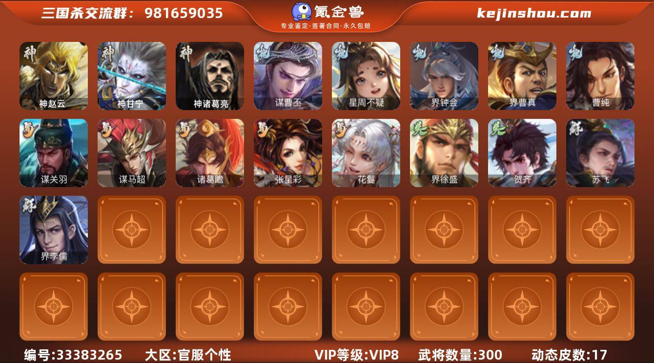 标题:S37184 【支持分期】 VIP等级:VIP8 官阶:骠骑将军 史诗武将数量:20 动态皮肤数量:17 史诗宝珠数量:0 将魂数量:106 雁翎数量:35338 心愿积分:5512 史诗武将(魏国):谋曹丕,界钟会,星周不疑,界曹真,程昱,曹纯 史诗武将(蜀国):谋关羽,花鬟,张星彩,诸葛瞻,马云禄,谋马超 史诗武将(吴国):界徐盛,贺齐 史诗武将(群雄):界李儒,左慈,兀突骨,苏飞 史诗武将(神将):神甘宁,神赵云