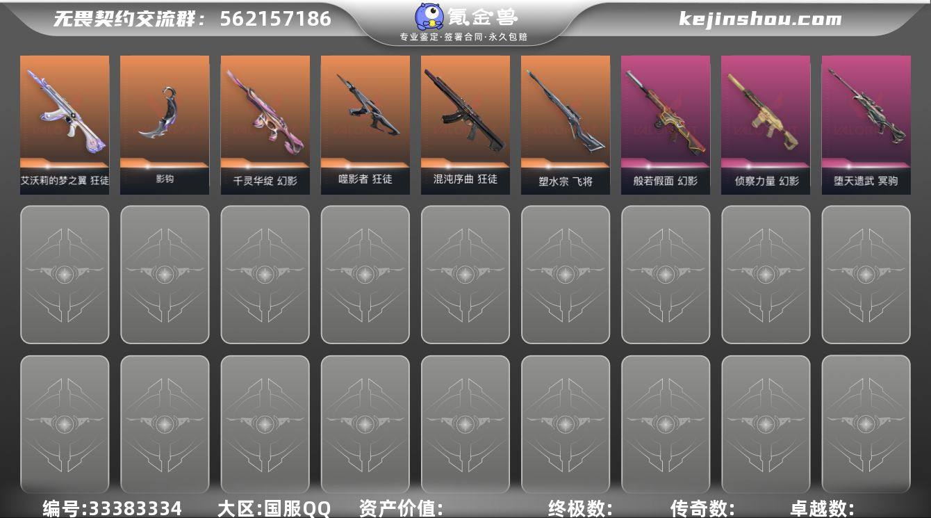 【sf236】【套装】:2022全球冠军赛套装,RGX 11z Pro//2.0套装,归零者//2.0套装,掠影//2.0套装 【英雄】:幻棱,炼狱,维斯,暮蝶,钛狐,壹决,铁臂,捷风,雷兹,幽影,不死鸟,贤者,猎枭,蝰蛇,零,芮娜,奇乐,尚勃勒,霓虹,斯凯,夜露,星礈,K/O,海神,盖可,黑梦,钢锁 【近战武器】:近战武器-2022全球冠军赛 蝴蝶刀,近战武器-碎心裂刃,近战武器-影钩,近战武器-RGX 11z Pro//2.0 蝴蝶刀,近战武器-RGX 11z Pro//3.0 爪刀,近战武器-落英飞旋,近战武器-荒土机兵 热能刀,近战武器-生物分子解离器,近战武器-诡秘蛇影 军刀,近战武器-神圣领域 战刀,近战武器-日耀风暴 遗器,近战武器-阿特拉斯指挥部 甩棍,近战武器-星际猎兵 短剑 【狂徒】:狂徒-归零者,狂徒-混沌序曲,狂徒-噬影者,狂徒-ORA x 颗秒,狂徒-荆刺圣骸,狂徒-艾沃莉的梦之翼,狂徒-般若假面//2.0,狂徒-荒土机兵,狂徒-诡秘蛇影 【幻影】:幻影-2022全球冠军赛,幻影-归零者//2.0,幻影-千灵华绽,幻影-RGX 11z Pro//2.0,幻影-般若假面,幻影-侦察力量,幻影-掠影//2.0,幻影-神圣领域,幻影-纳米打击,幻影-末日之翼 【戍卫】:戍卫-归零者//2.0,戍卫-逆冲蛮牛,戍卫-月球哨兵,戍卫-折...
