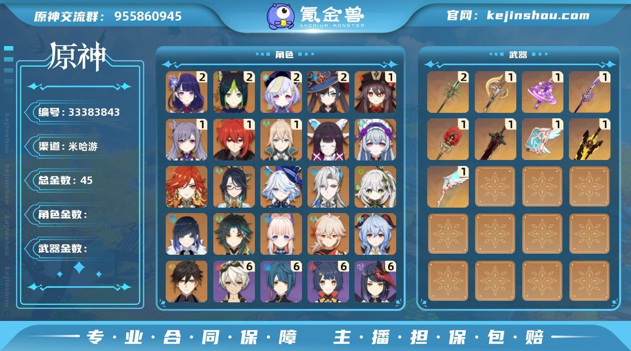 【原神】冒险等级:59,五星数量:32,五星角色:雷电将军 * 2命,莫娜 * 2命,七七 * 2命,提纳里 * 2命,迪卢克 * 1命,胡桃 * 1命,刻晴 * 1命,琴 * 1命,珊瑚宫心海,玛薇卡,钟离,梦见月瑞希,那维莱特,夜兰,芙宁娜,闲云,纳西妲,哥伦比娅,枫原万叶,甘雨,魈__五星武器:和璞鸢 * 2精,裁断,护摩之杖,狼的末路,天空之卷,天空之翼,无工之剑,薙草之稻光,神乐之真意__四星角色:班尼特 * 6命,行秋 * 6命,九条裟罗 * 6命,香菱 * 6命,鹿野院平藏 * 6命,凝光 * 6命,迪奥娜 * 6命,瑶瑶 * 6命,坎蒂丝 * 6命,早柚 * 6命,五郎 * 6命,烟绯 * 6命,辛焱 * 6命,诺艾尔 * 6命,罗莎莉亚 * 6命,菲谢尔 * 6命,北斗 * 6命,柯莱 * 5命,云堇 * 5命,托马 * 5命,砂糖 * 4命,多莉 * 4命,重云 * 4命,芭芭拉 * 3命,塔利雅 * 3命,卡齐娜 * 2命,珐露珊 * 2命,雷泽 * 2命,琳妮特 * 2命,久岐忍 * 1命,莱依拉 * 1命,夏洛蒂 * 1命,埃洛伊,奇偶·女性,绮良良,卡维,菲米尼,伊法,赛索斯