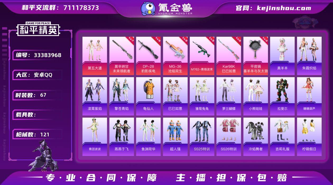 安卓 手Q H-AW037-1粉装-6特效枪-0载具-0粉色飞行器-33524热力值-2王牌印记-67套装-121枪皮 【热门品类】:套装-龟仙人 【粉色套装】:粉装-第五大道 【粉色枪皮等级】:M762-青锋波束(五级),Kar98K-巳巳如意(五级),莫辛纳甘-未来领航者(七级),DP-28-豹影疾电(五级),MG-36-沧焰双生(五级),平底锅-喜羊羊与灰太狼(三级) 【粉色枪皮】:M762-青锋波束,Kar98K-巳巳如意,莫辛纳甘-未来领航者,DP-28-豹影疾电,MG-36-沧焰双生,平底锅-