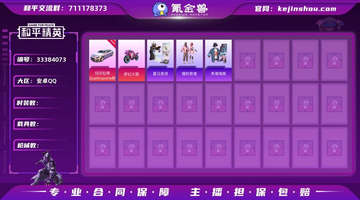 DSH2511【51套装 67枪皮 2载具1红车 玛莎拉蒂 】安卓手Q-2载具-51套装-67枪皮-1王牌印记-坚韧铂金Ⅴ-21847热力值【2载具】玛莎拉蒂Quattroporte(幻星粉)[1级],双人摩托-梦幻火箭【1稀有】VS战队服【1飞行器】梦幻火箭飞行器【1头盔】梦幻火箭头盔【1背包】梦幻火箭背包【117其它衣服和枪皮】暖心熊熊,耀粉歌者,轻风白浪,SS19特训,橘黑制服,竞技名士,特训学院,麻辣教官,SS29特训,炫蓝之夏,娇憨猪猪,SS37特训,冷焰舞者,酸甜橘柚,龙魂突击队,SS30特训,酷潮明星,幻影武者,暖心橘喵,黑色伏地魔,SS22特训,探宝勇士,魅力单车,红色运动,沙漠毒蛇,萌趣咩咩,特殊使命,牛气满满,绮丽涂鸦,幻世战舞者,SS20特训,竞技达人朋克,蓝色运动,玉兔迎春,缤纷果语,海盐绵绵冰,长空猛禽,夏日音浪,完美偶像,弄潮海豚,SS36特训,SS31特训,猛禽,破晓战魂,冰川特警,SS21特训,白色伏地魔,牛气冲天,黄色运动,战术大师,Vector-田园牧歌,SCAR-L-炫彩节奏,AC-VAL-天降萌叽,汤姆逊-耀粉歌者,P90-飞驰魅影,蝎式手枪-金丰海韵,Mk14-乌木金纹,SPAS-12-田园牧歌,平底锅-娇憨猪猪,Kar98K-红色方程式,UMP45-夜灯,沙漠之鹰-旋转彩虹,Kar98K-梦幻火箭,M24-影袭,AWM-天降萌叽,UZI-红色方程式,ACE32-冰晶雪宝,M16A4-幻世战舞...