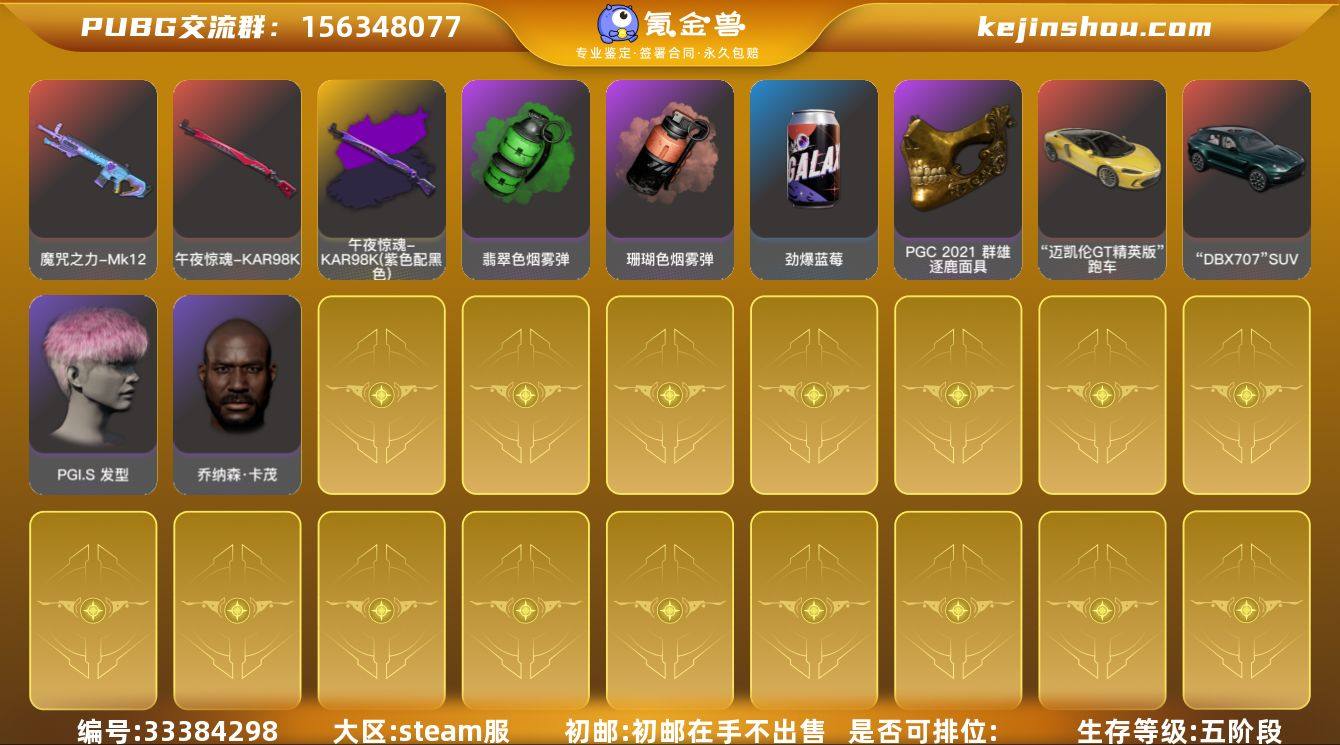 账号来源: 自营 初邮情况: 初邮在手不出售 热门装扮: 金面具,黑鬼 拥有成长型武器: 恶魔猎手-ACE32,孙悟空-M24