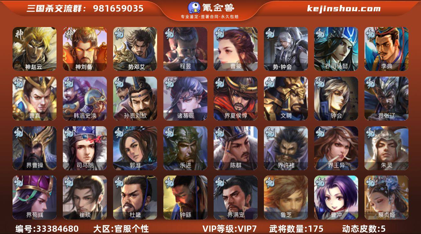 【14790159】官阶:中军将军;VIP等级:VIP7;史诗武将数量:10;动态皮肤数量:5;武将总数:175;史诗宝珠数量:20;将魂数量:2101;神将:2;魏国史诗武将:0;蜀国史诗武将:0;吴国史诗武将:2;群史诗武将:4