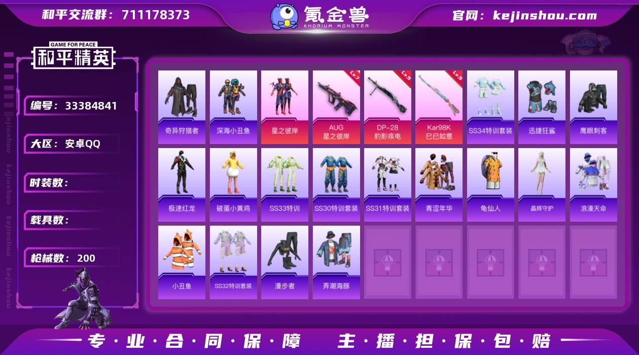 安卓Q 可二次 1粉装7特效枪175套装200枪皮 奇异狩猎者 AKM-缤纷海域 浪漫天命 星之彼岸 AKS-74U-森灵之息(5级) Kar98K-巳巳如意(5级) DP-28-豹影疾电(5级) AUG-星之彼岸(7级) 信号枪-金乌曜日(1级) Mk14-福马献瑞(4级) UMP45-萌骑冒险(1级) 星之彼岸飞行器 深海小丑鱼头盔 金羽特工头盔 梦幻火箭背包 深海小丑鱼背包 小丑鱼 龟仙人 青涩年华 晶辉守护 鹰眼刺客 迅捷狂鲨 深海小丑鱼 TT战队服 漫步者 破蛋小黄鸡 极速红龙 弄潮海豚 AKM-奇异狩猎者 M762-奇异狩猎者 M24-奇异狩猎者 S686-奇异狩猎者 和平精英账号
