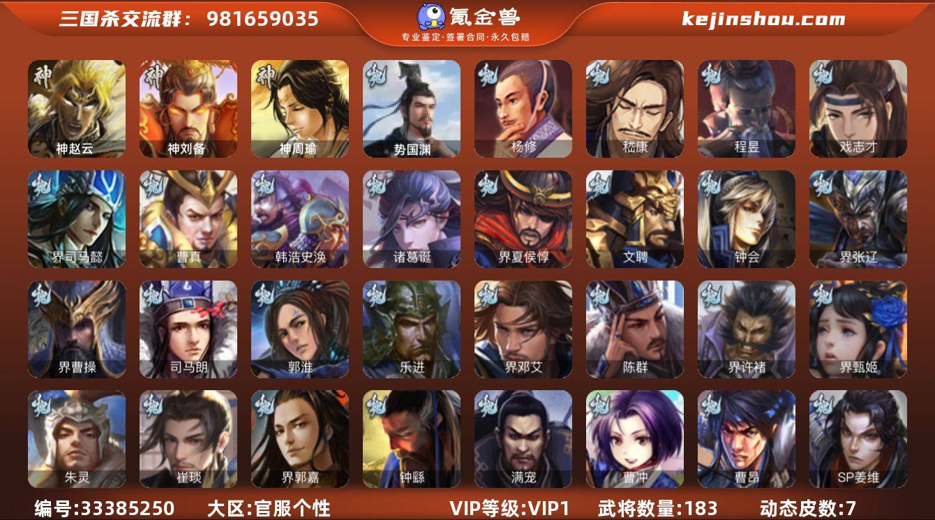 神赵云,神刘备,杨修,嵇康,戏志才,势国渊,程昱,势魏延,界徐盛,神周瑜,SP关羽,SP曹仁,乐进,曹昂,诸葛诞,朱灵,文聘,SP姜维,钟会,曹冲,郭淮,满宠,界曹操,界司马懿,界夏侯惇,界张辽,界许褚,界郭嘉,曹真,韩浩史涣,陈群,钟繇,司马朗,界甄姬,界邓艾,崔琰,唐咨,SP孙尚香,夏侯霸,马良,关兴张苞,廖化,界马岱,关平,刘封,界法正,界关兴张苞,界刘备,界关羽,界张飞,SP徐庶,吴懿,周仓,张松,夏侯氏,李严,界诸葛亮,赵统赵广,界伊籍,界孟获,界姜维,张翼,彭羕,界张嶷,诸葛果,甘夫人,诸葛瑾,孙鲁育,程普,韩当,潘璋马忠,虞翻,朱然,界甘宁,界吕蒙,界黄盖,界周瑜,界大乔,界陆逊,孙鲁班,朱桓,顾雍,孙休,孙登,界孙权,许贡,张温,界顾雍,界孙休,界小乔,友庞统,伏完,界袁术,SP赵云,张宝,伏皇后,李儒,华雄,袁术,界华佗,界吕布,公孙瓒,公孙渊,郭图逢纪,曹节,SP太史慈,卢植,刘琦,界颜良文丑,张济,董承,界刘表,星张辽,王濬,谋卢植,张任,李傕郭汜,骥李典,神赵云-战龙在野(动态),神周瑜-波澜不惊,张昌蒲-龙年端午(...