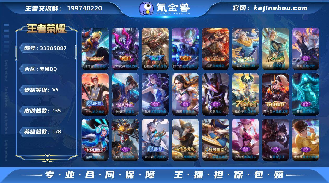 【XY1338】贵族等级5/荣耀典藏数量1/传说皮肤数量3/史诗皮肤数量42/皮肤数量155/英雄数量128/段位至尊星耀/全息碎影/零号·赤焰/地狱之眼/超时空战士-狄仁杰/阴阳师/皇家上将/神迹守卫-墨子/蔷薇恋人/玩趣恶龙/无心/万华元夜(s22)/沙漠行僧(s26)/海滩派对/醍醐杖(s20)/航海奇遇记/逐梦之音/演武夺筹(s23)/金庭之子(s27)/至尊宝/云中旅人(s29)/驱傩正仪(s24)/黎明之约/原初探秘者(s21)/五谷丰年/千军破阵(s25)/原初追遂者/顽趣-梦奇/大漠名商(s28)/疑决卦(s19)/擒涛扼浪(s31)/纤云弄巧/探海日志(s32)/海盐诗旅(s30)/古海寻踪(s33)/蒙恬荣光圣徽/鬼谷子天穹祈灯(S34)/剑破天穹(s35)/谧流熔炉/逆浪荇歌/荣光之誓/九幽镇关/线条小狗-周瑜/海月海之女神/万灵启世/百相守梦-黄忠/龙之律动/鹰眼统帅/猫狗日记-孙策/节奏热浪/星夜王子/功夫厨神/舞动绿茵/特工魅影/心灵战警/黄金分割率/暗隐猎兽者/德古拉伯爵/水晶猎龙者/白龙吟/乱世虎臣/末日机甲-吕布/幽灵船长/圣诞狂欢/金属风暴/魅力维加斯/摇滚巨星/水果甜心/鬼剑武藏/冰雪圆舞曲/圣诞恋歌/未来纪元-赵云/紫霞仙子/影百相守梦/溯影追猎/鹤鸣心笺/踏浪烽翎/死霸装/命运加冕/布丁狗之约/灵野札记/春野闲踪/浪漫序章/玫蓝誓约/星梦巡...