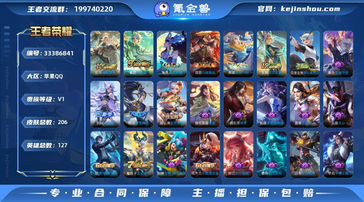 苹果Q-V0-至尊星耀IV段位-127英雄-206皮肤-2传说-54史诗 【英雄全皮】:敖隐全皮,空空儿全皮 【传说皮肤】:后羿神树通天,桑启鸣野蒿 【限定皮肤】:蒙犽顽岩魄,姜子牙天穹之誓,狄仁杰阴阳师,嬴政优雅恋人,孙尚香蔷薇恋人,庄周高山流水,芈月幻夜卜梦,元歌无心,甄姬游园惊梦,达摩沙漠行僧,项羽海滩派对,韩信傲雪梅枪,兰陵王金庭之子,李元芳云中旅人,钟馗驱傩正仪,杨玉环遇见飞天,鬼谷子五谷丰年,黄忠火炮绅士,苏烈千军破阵,百里玄策原初追逐者,梦奇顽趣,沈梦溪大漠名商,裴擒虎擒涛扼浪,鲁班大师探海日志,桑启海盐诗旅,阿古朵江河有灵,张良古海寻踪,蒙恬荣光圣徽,鬼谷子天穹祈灯,姬小满妄想食味,沈梦溪龙舞盛年,刘邦剑破天穹,程咬金群星魔术团,周瑜熔金海岸 【赛季限定】:钟馗驱傩正仪,苏烈千军破阵,达摩沙漠行僧,兰陵王金庭之子,沈梦溪大漠名商,李元芳云中旅人,桑启海盐诗旅,裴擒虎擒涛扼浪,鲁班大师探海日志,张良古海寻踪,鬼谷子天穹祈灯,刘邦剑破天穹,姜子牙天穹之誓,东皇太一噬灭天穹,太乙真人谧流熔炉,钟馗虚灵犬护,甄姬逆浪荇歌,亚瑟荣光之誓,百里玄策原初追逐者,梦奇顽趣,蒙恬荣光圣徽,牛魔星界战将,项羽九幽...