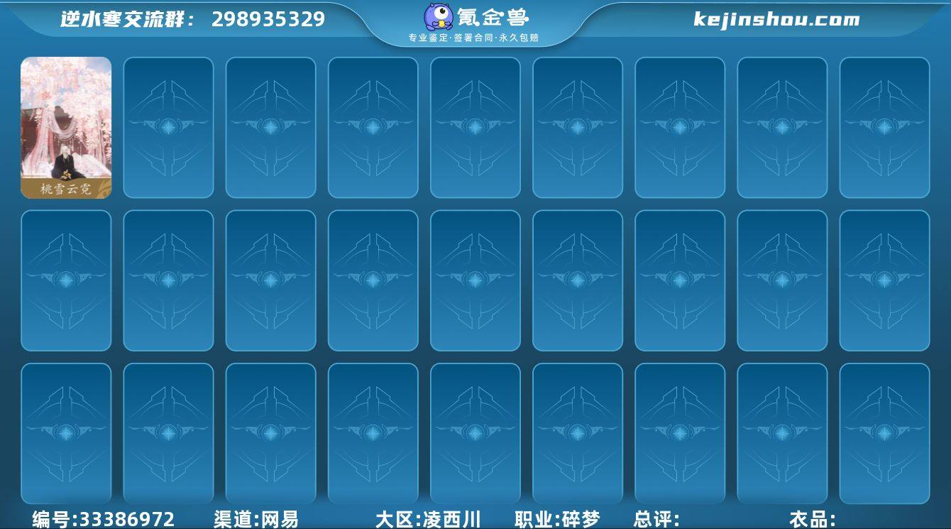 【已用天赏石6-转职卷*4】战力值:2099758 总评:2099758 角色等级:89 衣品值: 92865 国色值: 14040 已用天赏石:6 天霓染数量:1 【网易手机账号】 【无换绑冷却】 【碎梦】 【女】 【2级】 【放歌清宵】 【互通】 天赏外观1 天赏祥瑞1 武器环身3 天赏外观:水武器; 天赏祥瑞:桃雪云霓; 武器环身:掌星执辰,银甲霜锋,南枝已谢;