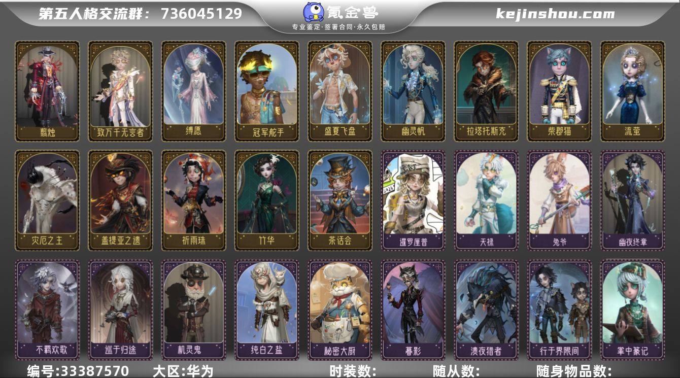 杰克-翦烛,佣兵-致万千无言者,昆虫学者-缚愿,击球手-冠军舵手,勘探员-盛夏飞盘,作曲家-幽灵帆,幸运儿-拉塔托斯克,佣兵-柴郡猫,医生-流萤,黄衣之主-灾厄之主,勘探员-盖提亚之遗,杂技演员-祈雨珠,红蝶-竹华,杂技演员-茶话会 卖家说:可小刀