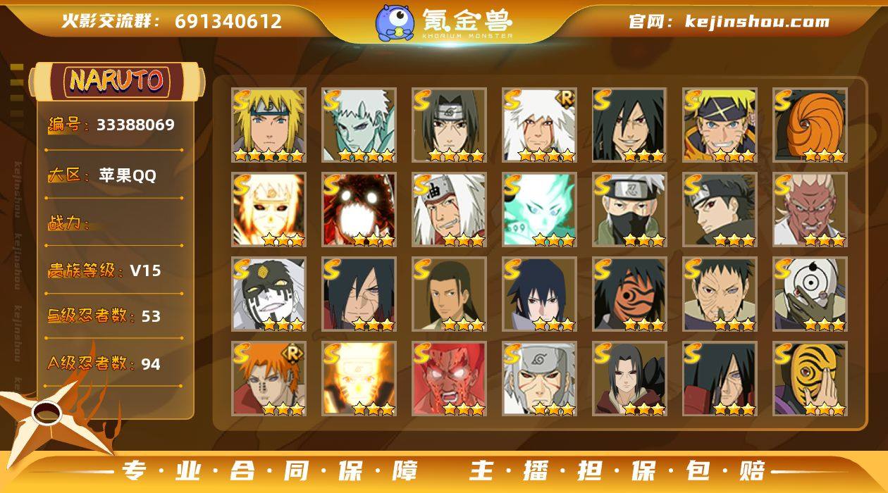 苹果Q区2352万充值6万战力53S95A49通灵73级魅力六道带土秽土柱间648奥义6个168奥义全主场景4个动态头像一张名片1.6万金币