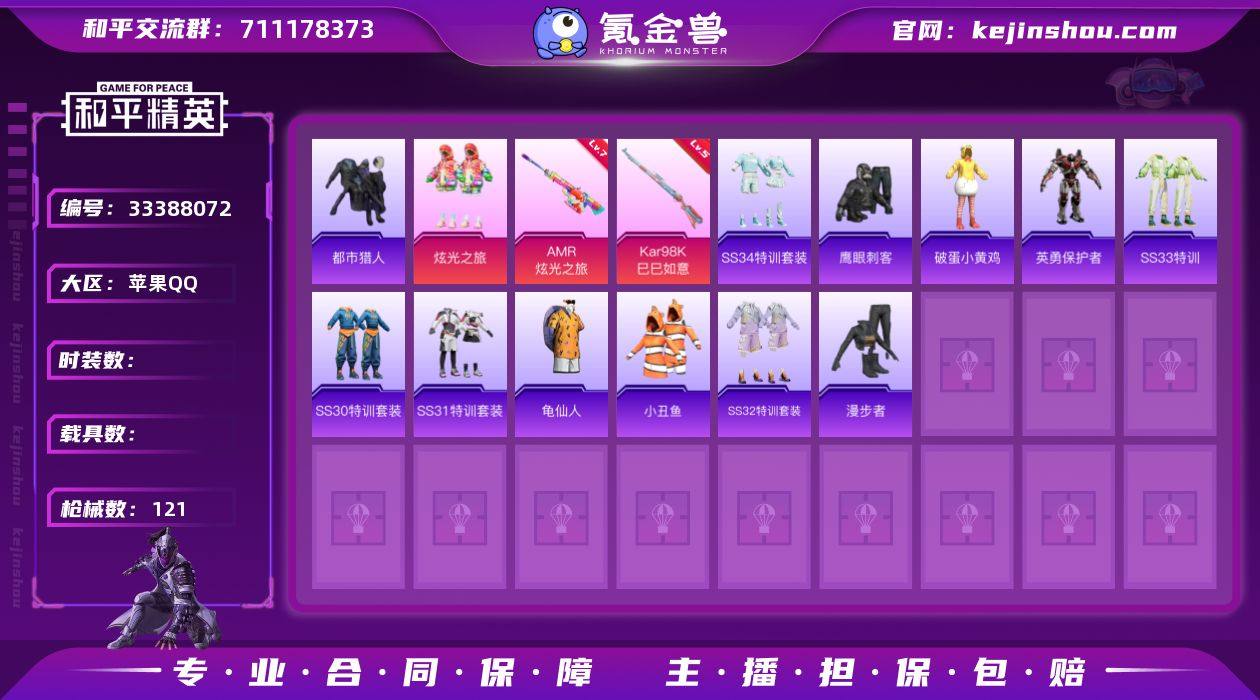 不可二次 苹果Q 1粉装4特效枪95套装121枪皮 都市猎人 炫光之旅 Kar98K-巳巳如意(5级) AMR-炫光之旅(7级) Mk14-福马献瑞(5级) AA12-G-萌骑幻想(5级) 小丑鱼 龟仙人 鹰眼刺客 漫步者 破蛋小黄鸡 英勇保护者 和平精英账号