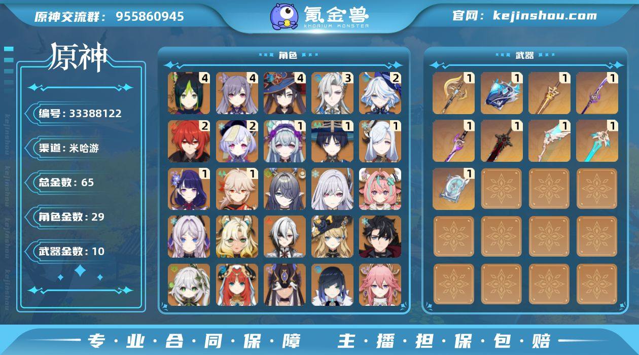 65黄!3+1那维莱特!二命芙宁娜!龙芙万希!仆人融化队!超绽放!月绽放战舰 !四命刻晴!四命莫娜!四命提纳里!二命迪卢克!二命七七!一命枫原万叶!1+1雷电将军!一命申鹤!一命流浪者!一命梦见月瑞希!神里绫华!宵宫!钟离!珊瑚宫心海!八重神子!夜兰!赛诺!0+1妮露!纳西妲!莱欧斯利!0+1娜维娅!阿蕾奇诺!希诺宁!茜特菈莉!瓦雷莎!丝柯克!菈乌玛 拥有武器: 狼的末路!天空之翼!雾切之回光!四风原典!天空之刃!薙草之稻光!圣显之钥!万世流涌大典!裁断 1精武器: 狼的末路!天空之翼!雾切之回光!四风原典!天空之刃!薙草之稻光!圣显之钥!万世流涌大典!裁断